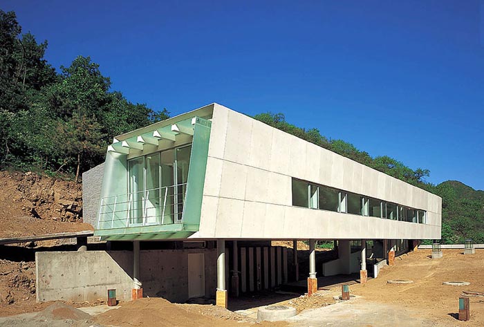 三號別墅客廳餐廳相連,室內室外相通,提供聚會的場所。居室除了主臥室,其他部分可自由分隔組成不同大小的房間。衛生間有兩個,必要時可分男女。主人的臥室挑出臺地上方,獨享開闊的視野和生活的私密。這種私密使衛生間得以開放,入浴也可觀賞山野的風光。當家里沒人的時候,仆人住在廊下,除了清掃不需要進入房間。廚房是開敞的,其實更象一個吧臺,朋友多時,會所準備的佳肴會通過專用出口提供,與客人活動區不干擾。另外別墅內還有司機房、洗衣房、設備間和車棚。