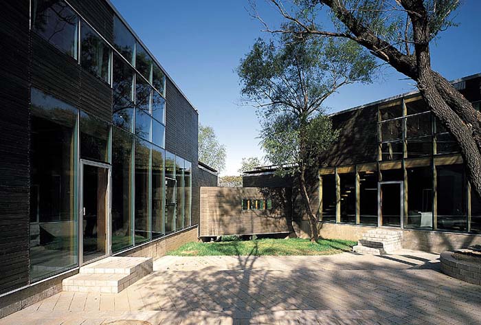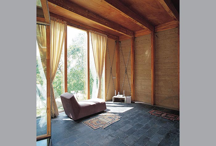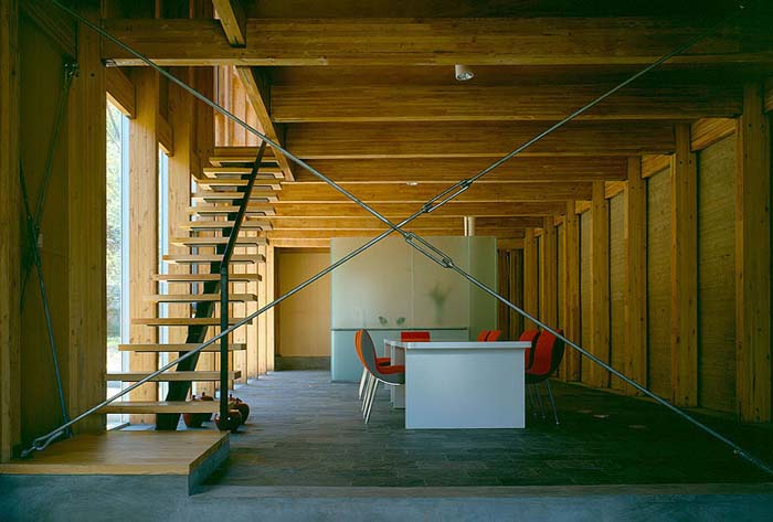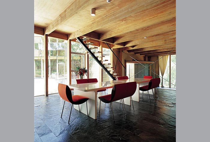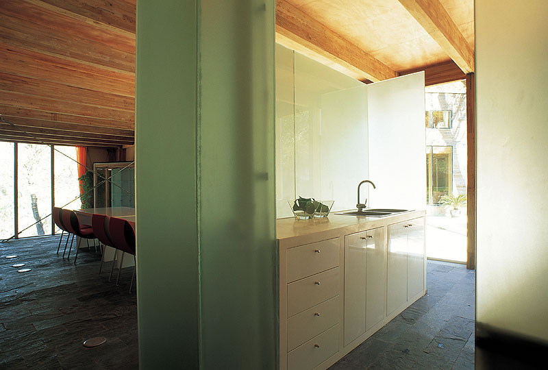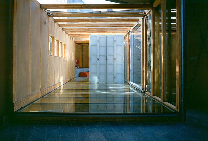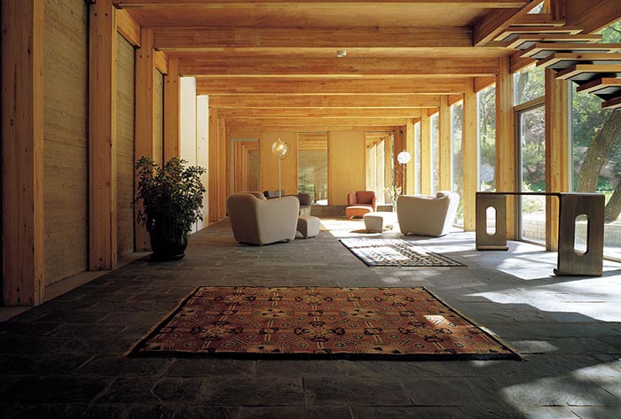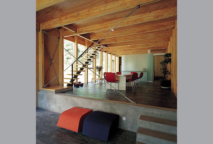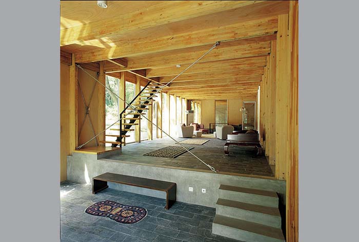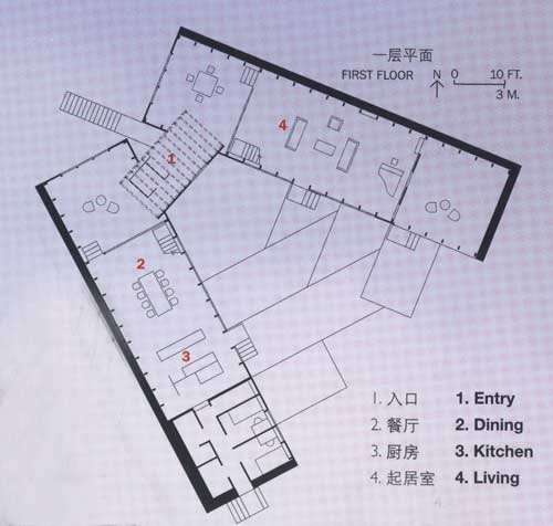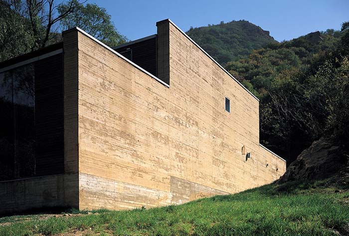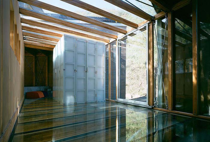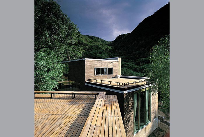 建筑從當中被分成兩半,藉以引入了不同的景致、空間,也帶入了"山水"意境。水的部分,有條小溪直直地登堂入室,在入口的玻璃地板之下粼粼閃光。中庭,則由一側的山巒與另一側住屋分裂的兩翼共同圍塑空間,柔和地處理了自然地京與人造建筑間的分際。