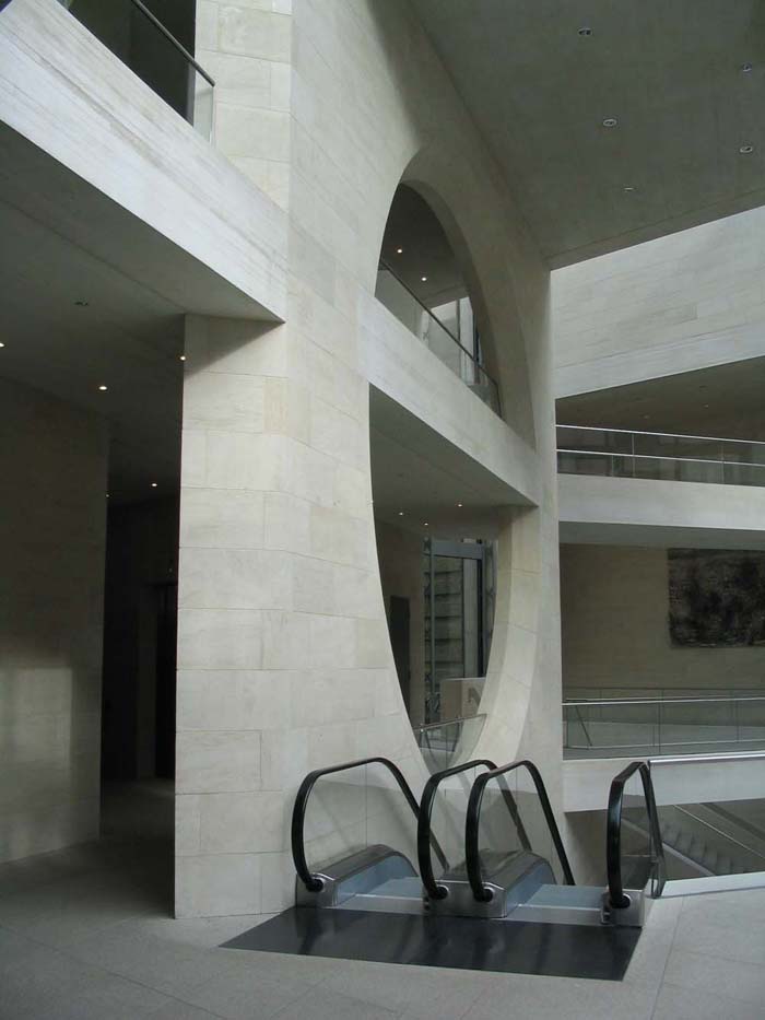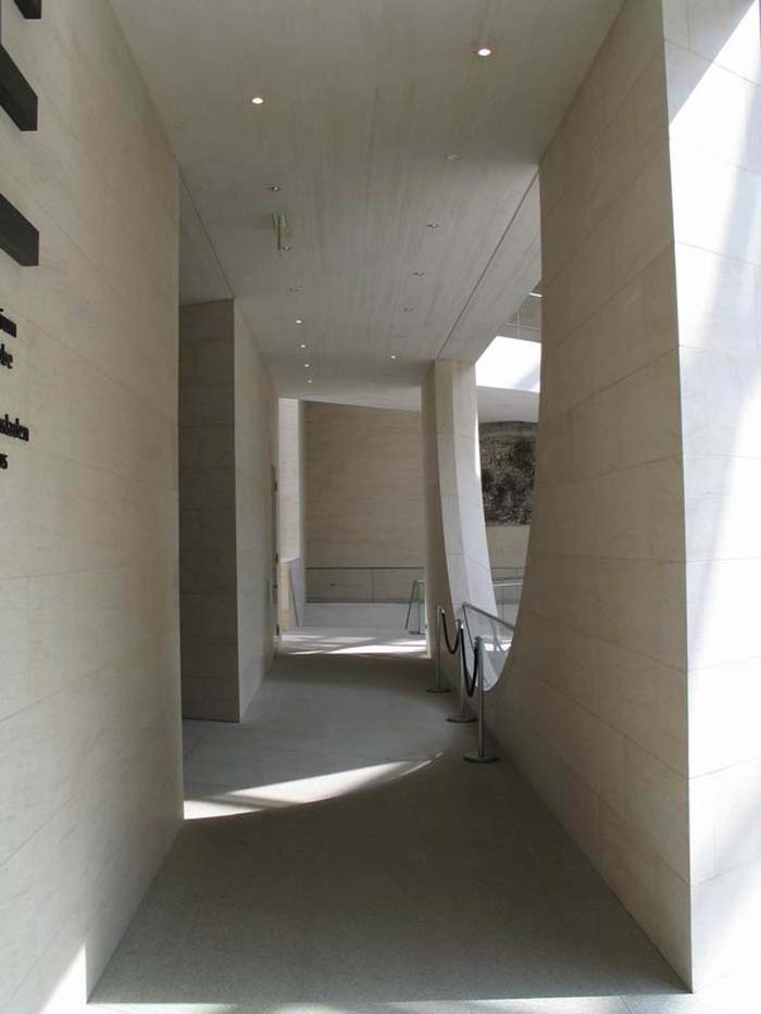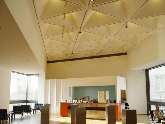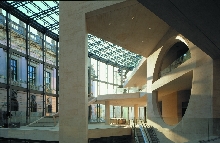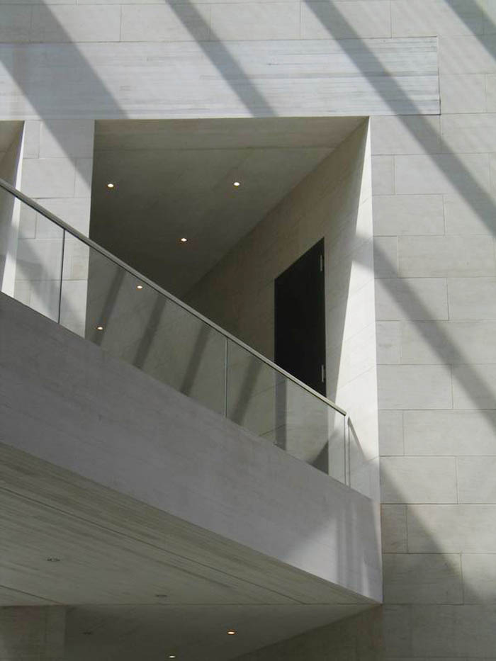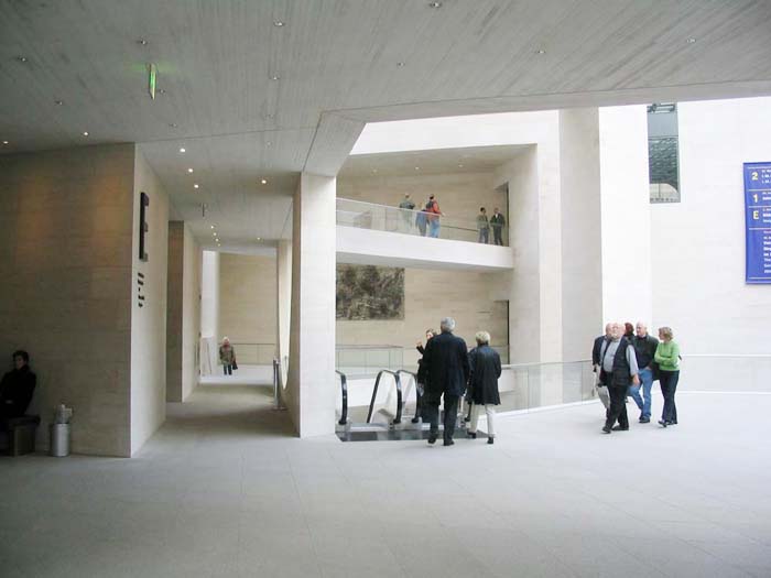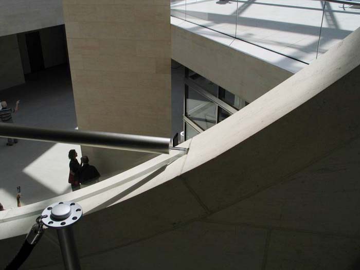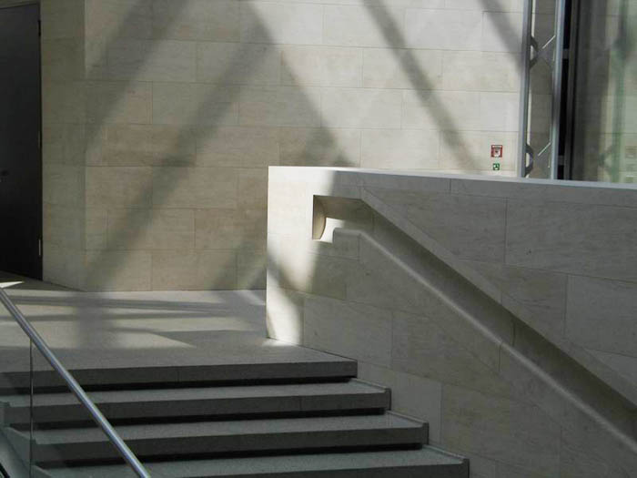 [page]各展廳設(shè)在一個(gè)以天然石料裝飾墻面,絕大部分為封閉的建筑體中。出于文物保護(hù)方面的原因,這些展廳都不開設(shè)窗戶,但各處都保持了同基本幾何體-三角體的關(guān)聯(lián)。僅只是在三樓按貝聿銘的想法在建筑體上切出了三角形的凹槽。一個(gè)屋頂平臺(tái)和一個(gè)凸出的玻璃內(nèi)陽臺(tái)實(shí)現(xiàn)了投向博物館島的視野和聚焦于新瓦赫及七葉樹林之目光的可能。在東端緊靠著博物館的管理樓是個(gè)L型的建筑。在里面設(shè)置了報(bào)告廳和藝術(shù)品修復(fù)工場(chǎng)。