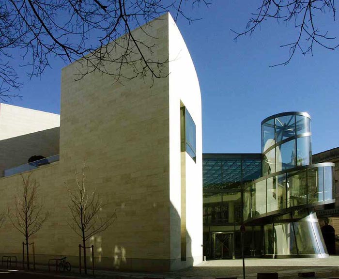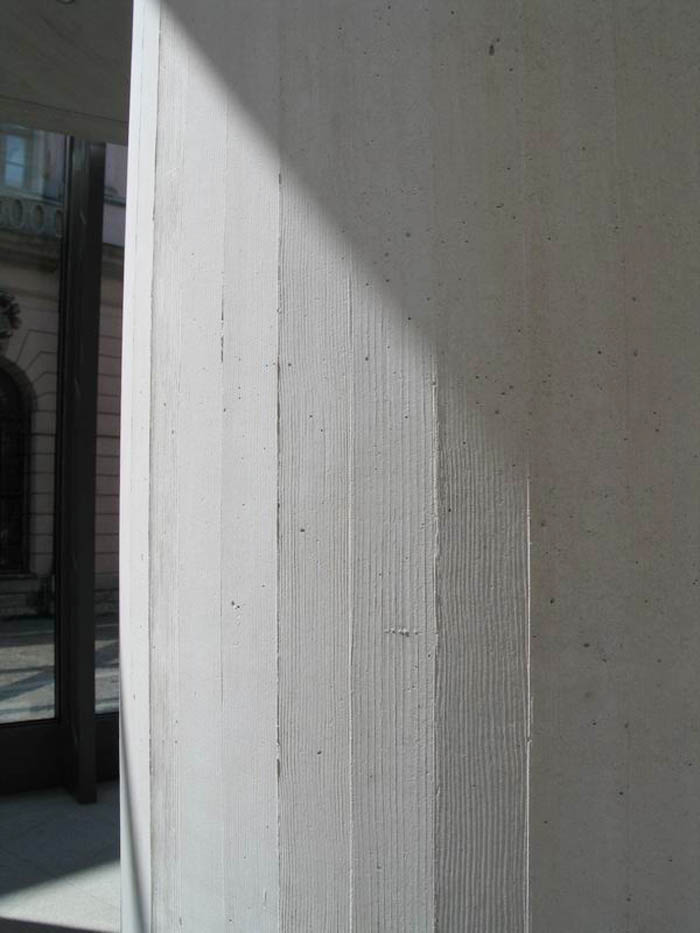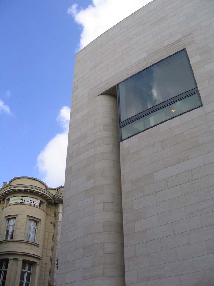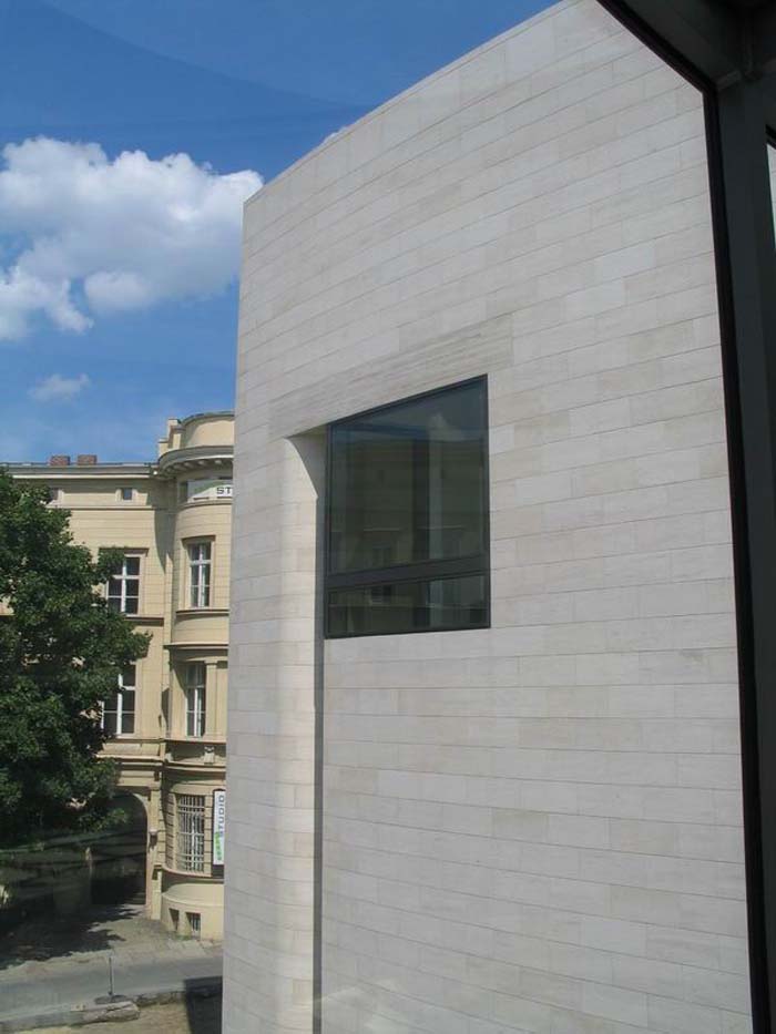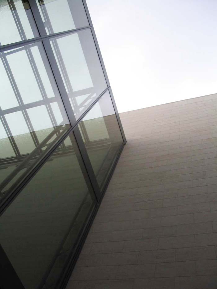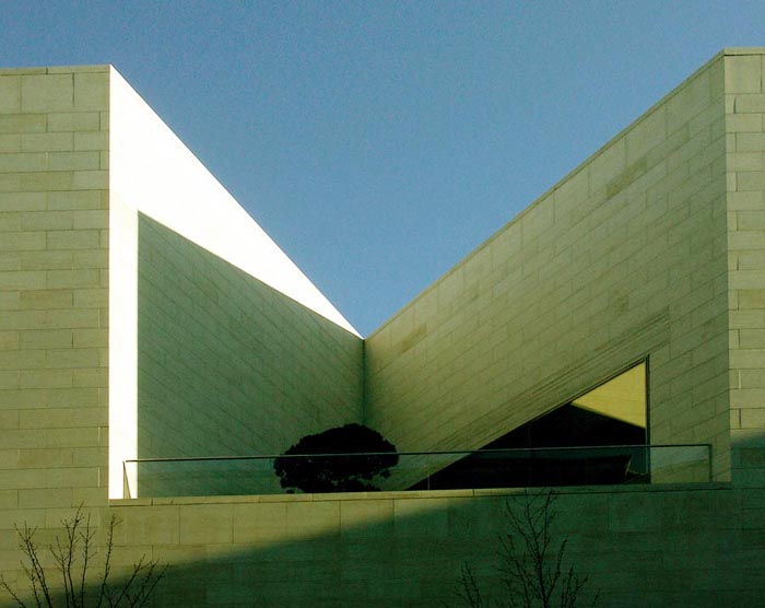 [page]各展廳設(shè)在一個(gè)以天然石料裝飾墻面,絕大部分為封閉的建筑體中。出于文物保護(hù)方面的原因,這些展廳都不開設(shè)窗戶,但各處都保持了同基本幾何體-三角體的關(guān)聯(lián)。僅只是在三樓按貝聿銘的想法在建筑體上切出了三角形的凹槽。一個(gè)屋頂平臺(tái)和一個(gè)凸出的玻璃內(nèi)陽臺(tái)實(shí)現(xiàn)了投向博物館島的視野和聚焦于新瓦赫及七葉樹林之目光的可能。在東端緊靠著博物館的管理樓是個(gè)L型的建筑。在里面設(shè)置了報(bào)告廳和藝術(shù)品修復(fù)工場(chǎng)。
