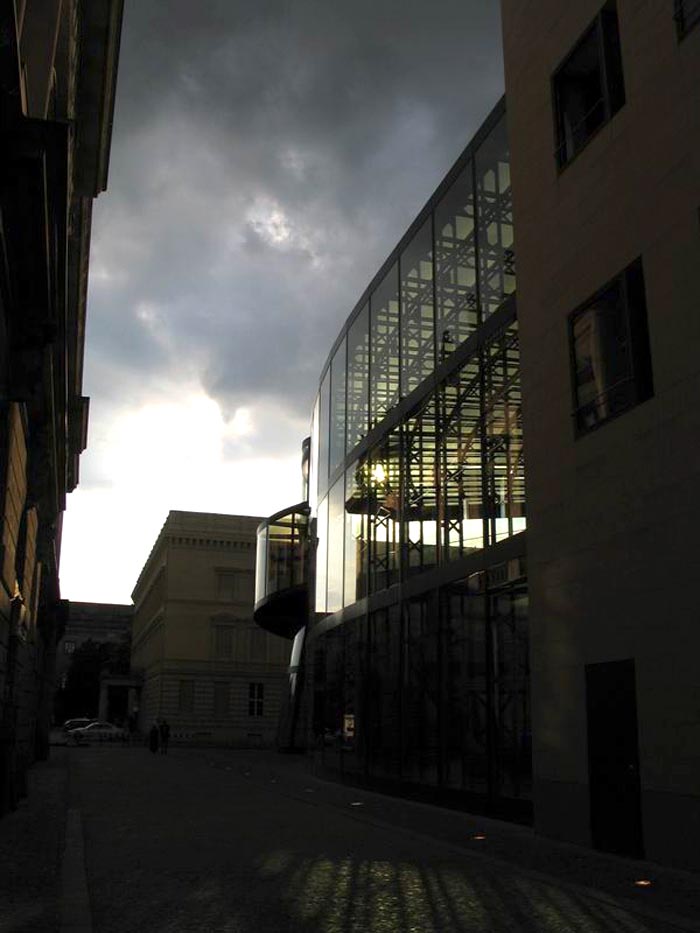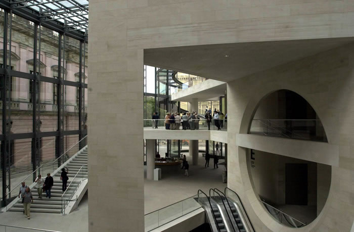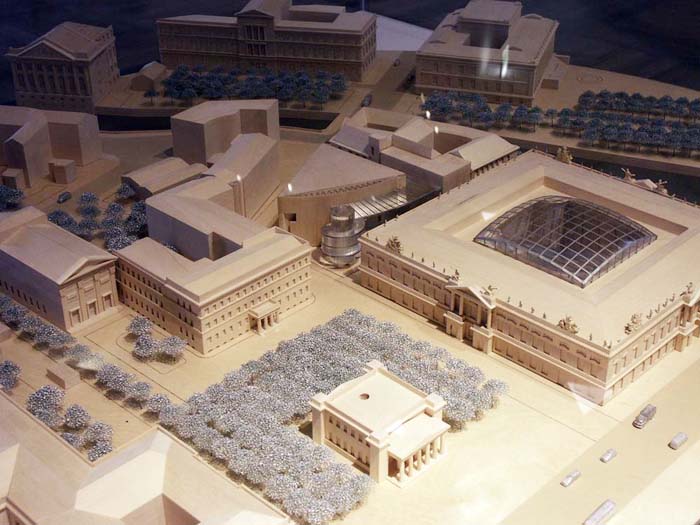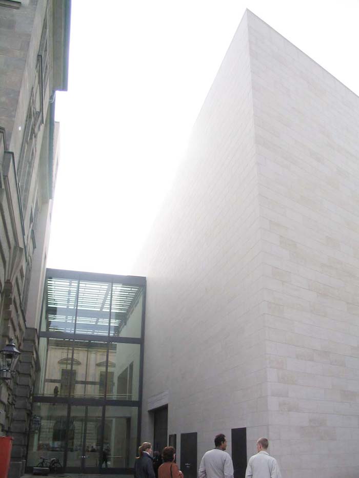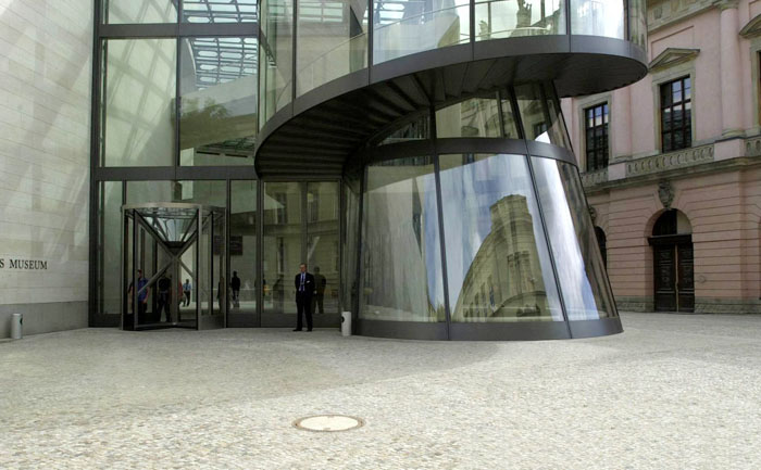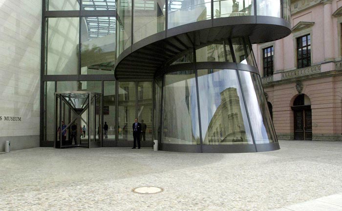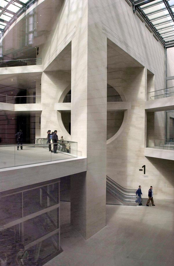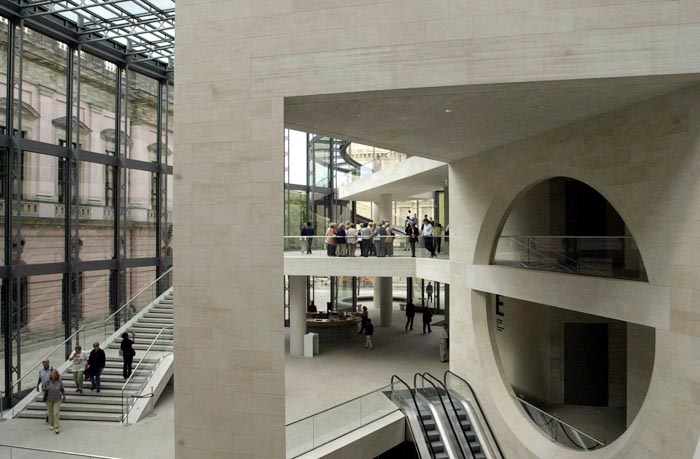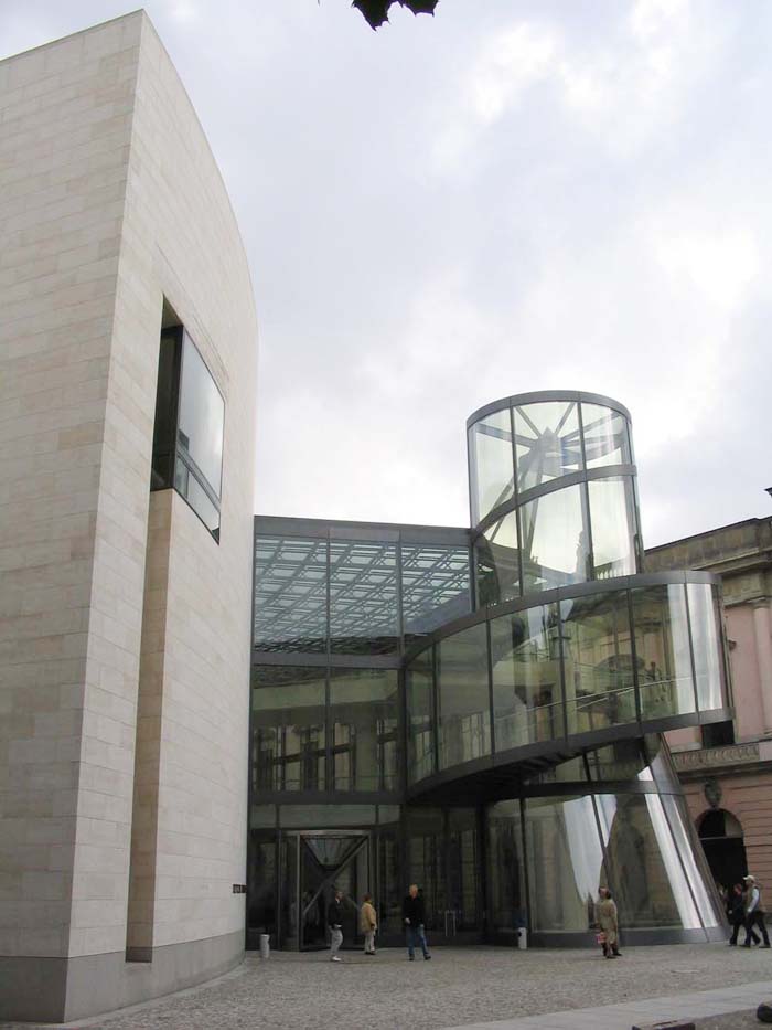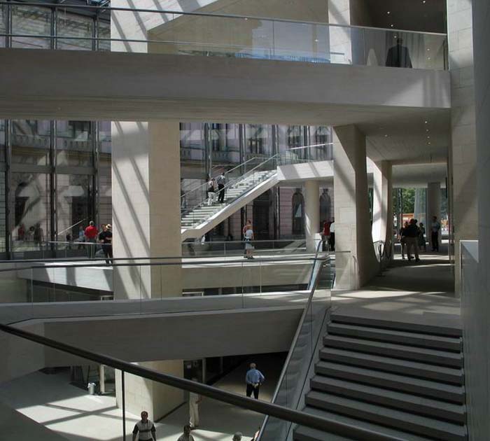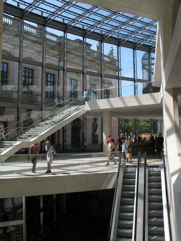 不過,軍械庫也是展示歷史與文化的地方。幾百年以來這里曾是軍火庫、英雄紀(jì)念館、納粹宣傳論壇。1952至1990年間,這里才成為博物館。這座1695年開始建造的建筑物上銘刻著巴洛克建筑師安德里亞斯·施呂特爾以及兩位1815年后被委派進(jìn)行改建工作的普魯士古典主義大師申克爾與沙多的富有特色的手跡。要為擴(kuò)建大樓尋找一種形式,這對(duì)貝聿銘來說是一個(gè)挑戰(zhàn):他面臨的挑戰(zhàn)是這幾位偉大藝術(shù)家的作品與一塊很小且位置很不利的地皮。這塊地皮在處于軍械庫陰影下的同時(shí),又正好是在通往著名的博物館島的通道上。