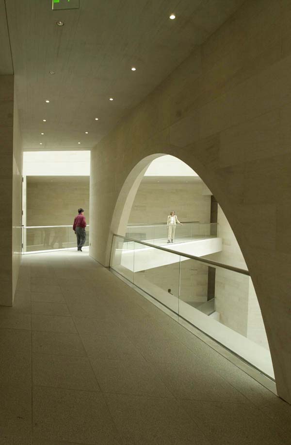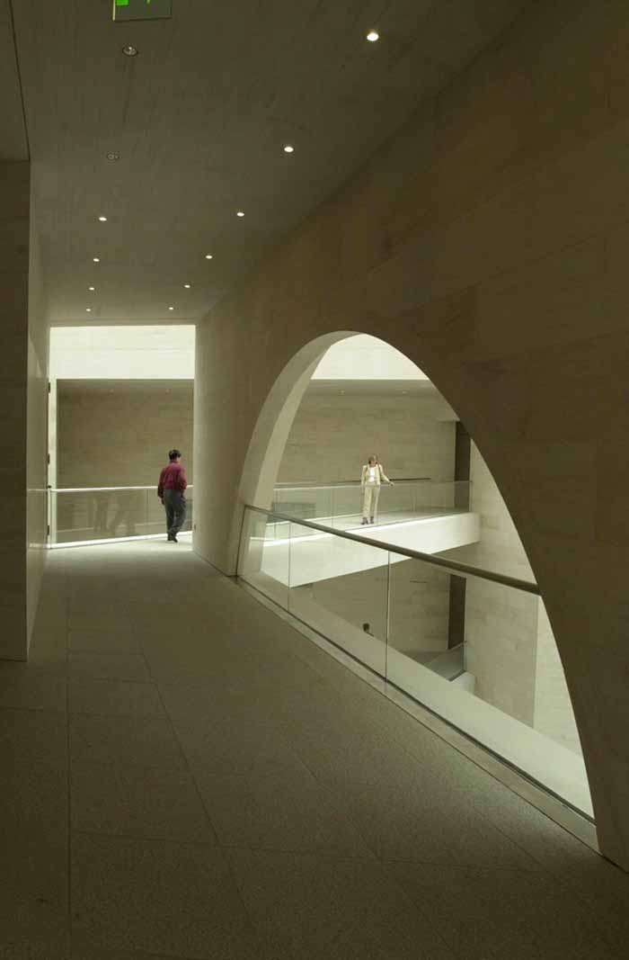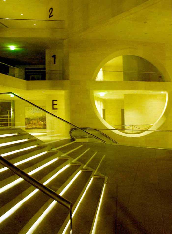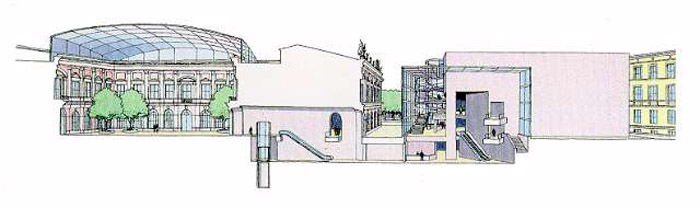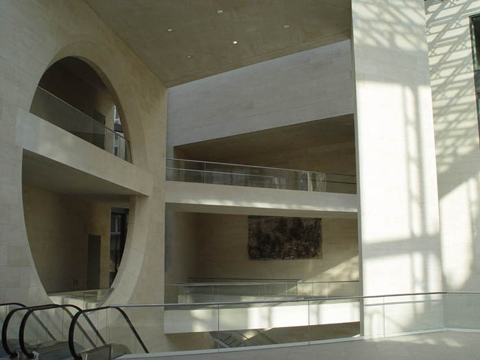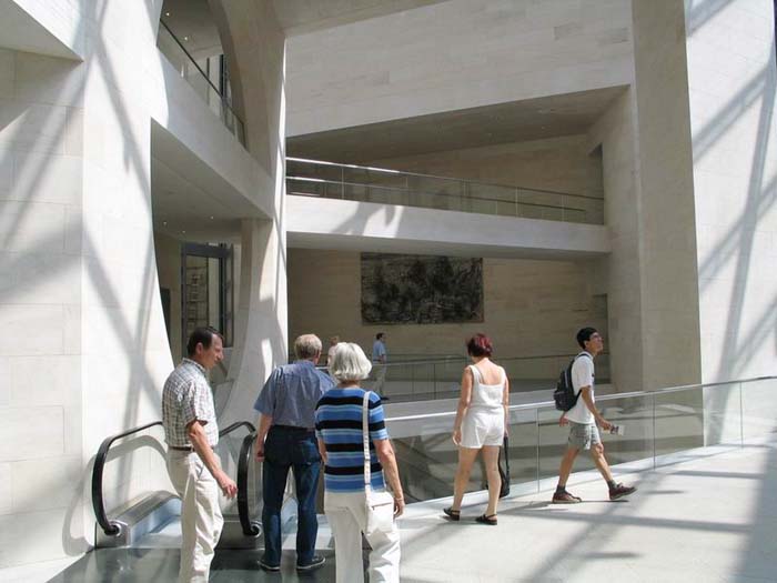 貝聿銘以這個(gè)朝向軍械庫和弗里德利齊亞諾廣場(chǎng)的視線軸使新老建筑物之間在建筑藝術(shù)上取得了一致。由地下一層敞開的大空間可使視線不受阻地投向天空。這個(gè)極為寬敞的空間是貝聿銘根據(jù)對(duì)歷史建筑文物保護(hù)所作的規(guī)定而構(gòu)思出的完美方案。從自動(dòng)扶梯,露天臺(tái)階,天橋或游廊人們總能將目光瞥向?qū)γ娴能娦祹炝⒚妗X愴层懛Q他的博物館建筑為“都市劇場(chǎng)”。從它的各個(gè)不同層面空間的交叉和垂直連接使得內(nèi)部空間在不同的角度出現(xiàn)各異的立體景象,不但極大地豐富了內(nèi)部的空域變化,也起到了同外部城市空間的關(guān)聯(lián)作用。