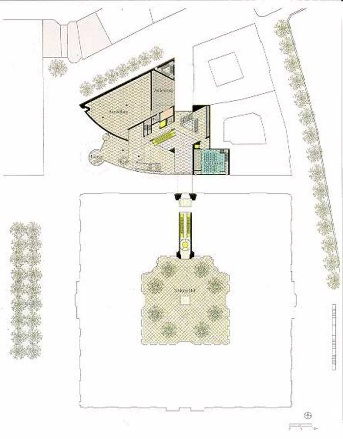 [page]如果人們要問“一個(gè)大型的建筑意味什么?”,那么用貝聿銘的話回答便是“大型的建筑并不意味著是個(gè)大的挑戰(zhàn)。”的確,這個(gè)夾在歷史老建筑物及其環(huán)境中間的基地狀況使得這個(gè)新館的設(shè)計(jì)成了對(duì)建筑師的很大挑戰(zhàn)。在這里,巴洛克建筑軍械庫在林登大街旁的弗里德利齊亞諾廣場(chǎng)上占居著主導(dǎo)地位。當(dāng)年卡爾·弗里德利希·辛克欲為他設(shè)計(jì)的羅馬式紀(jì)念堂找到合適的位置可謂絞盡腦汁。為了保證他的建筑在受巴洛克建筑物很大影響的環(huán)境中同樣具有空間作用,他在紀(jì)念堂周圍按比例布置了一片七葉樹林。這片樹林起到了使紀(jì)念堂建筑新瓦赫同巴洛克建筑軍械庫之間保持間距和聯(lián)系的作用。但也使從林登大街投向新館基地的目光多了一層限制。此外巴洛克建筑同毗鄰的宮殿建筑挨得那么緊,以致于人們只能透過“縫隙”般的視域看到新館。按建筑師的設(shè)計(jì)語言來說,這意味著幾乎沒有視野地可利用來展現(xiàn)建筑體及其立面。尤其是新館北向的背面緊鄰著老建筑馬克希姆·戈基劇院。雖然從那兒人們可以將視線投向遠(yuǎn)處博物館島上的弗里得利希·奧古斯特·施蒂勒(Friedrich August Stueler)設(shè)計(jì)的老國家美術(shù)館,佩加蒙博物館,恩斯特·馮·伊內(nèi)(Ernst von Ihne)的博德博物館以及位于趣園旁辛克的老博物館,但可見的新館背立面也僅只能從側(cè)面觀其整個(gè)。然而此刻卻沒有任何其他建筑物能夠象新館建造將會(huì)對(duì)這個(gè)區(qū)域產(chǎn)生深遠(yuǎn)的影響。因?yàn)檫@個(gè)城市空間的位置決定著德國歷史博物館越過施普雷支河與“文化的廣場(chǎng)”博物館島的無形聯(lián)系。