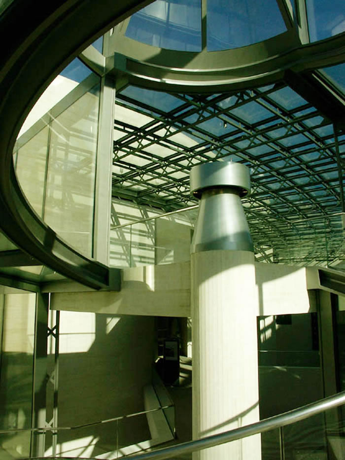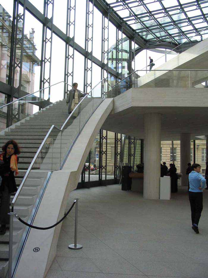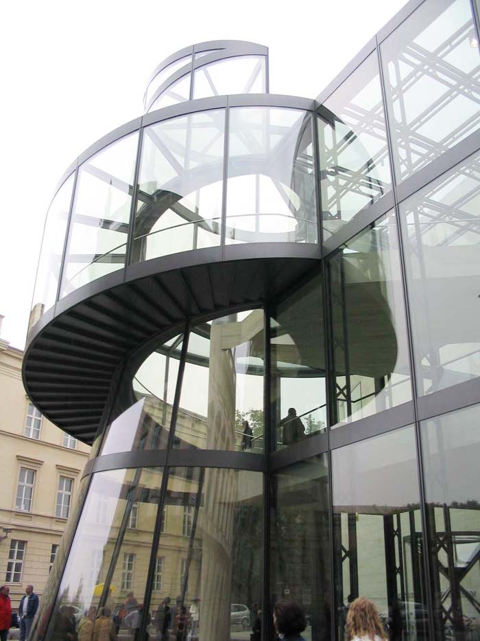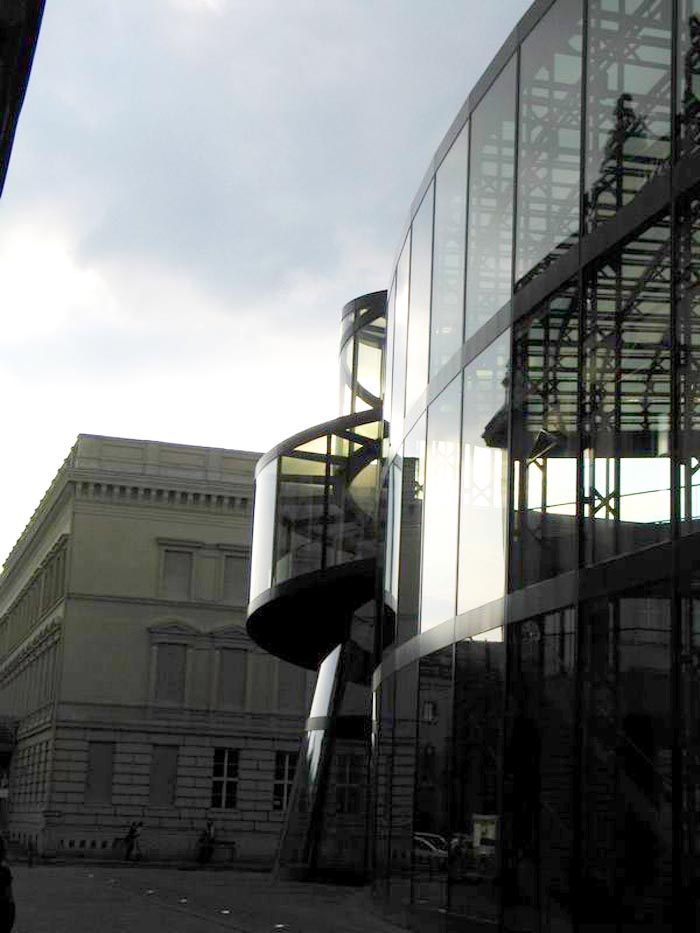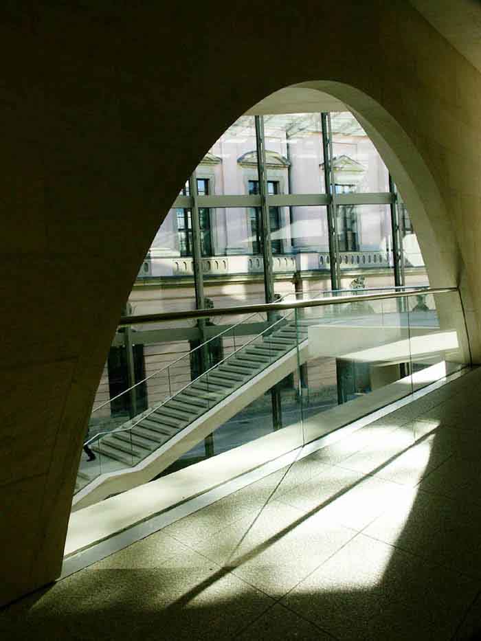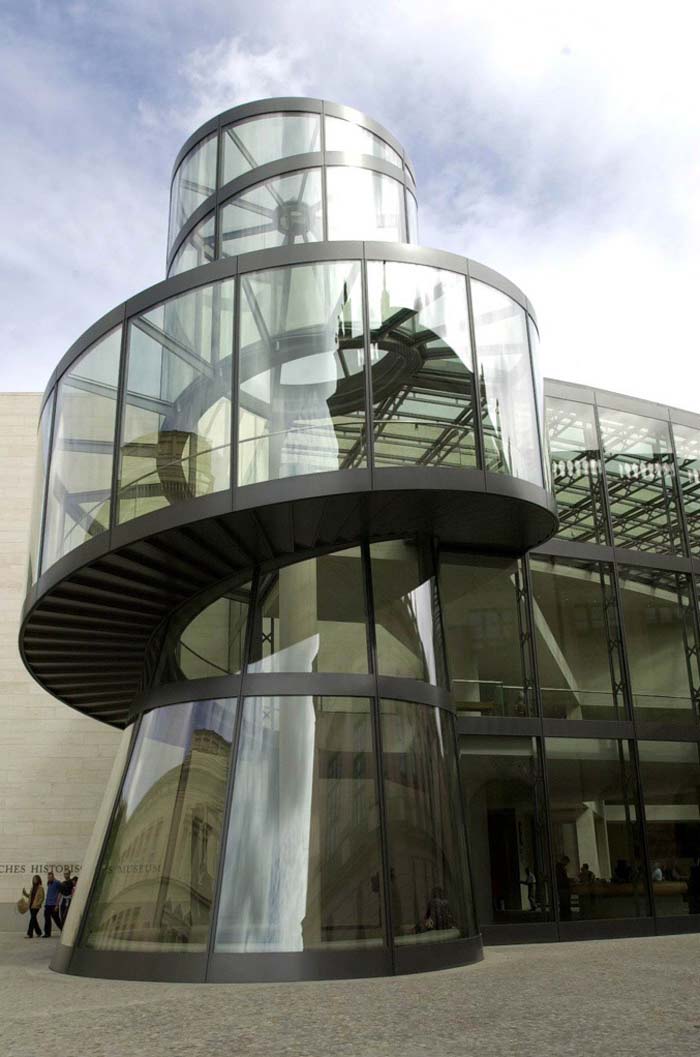 柏林上空的天似乎離德國歷史博物館新擴(kuò)建的大樓特別近。螺旋式樓梯的玻璃中心柱蜿蜒在三個(gè)樓層之間,看上去就像是一個(gè)透明的蝸牛殼。在每一個(gè)樓層,走廊就像露臺(tái)一樣伸進(jìn)雄偉的玻璃大廳,每一個(gè)玻璃大廳的圓頂以巨大的弧形凸出,在平時(shí)一般被遮擋住的大樓的整個(gè)邊上形成了拱形。一個(gè)巨大的玻璃柜,建筑學(xué)的展品,那是由玻璃、鋼筋與砂石組成的吸引觀眾的磁鐵--這就是德國第一個(gè)貝聿銘作品。