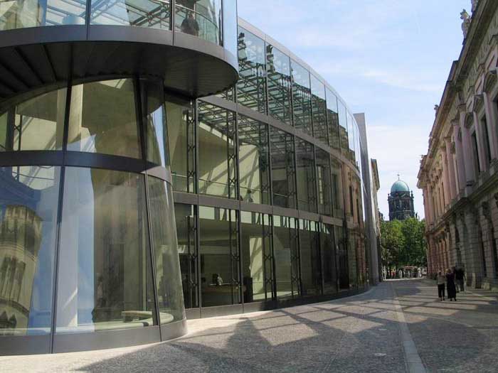德國歷史博物館所在的柏林博物館島區(qū),包括國家畫廊、收藏希臘羅馬雕像的佩家蒙國家博物館、考古博物館等十五、六座人類的文化與文明重要資產(chǎn),這些博物館正在進(jìn)行一個(gè)長達(dá)十五年曠世大計(jì)劃,聯(lián)邦政府從一九九七年啟動(dòng)的跨時(shí)程計(jì)畫,包括整修古博物館、增件數(shù)座新館舍、長達(dá)十余公里連通這十余座博物館的地下通道、以及將環(huán)繞于施普雷河畔的博物館島將興建一座玻璃體的新門面,都正在進(jìn)行之中。貝聿銘設(shè)計(jì)的德國歷史博物館就是這個(gè)大計(jì)劃中的先鋒構(gòu)思之一,在規(guī)模龐及四億五千萬歐元的歷史空間改造經(jīng)費(fèi)中,約占兩千萬歐元的大型建筑。