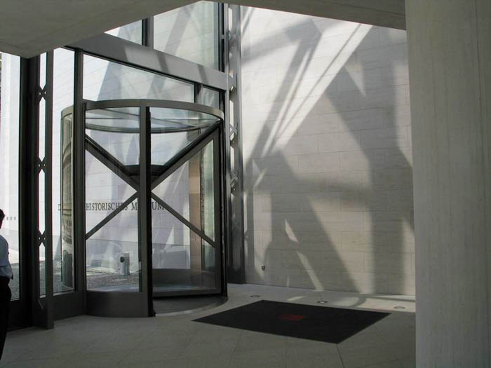 歷史博物館前身為暗藏在深巷中的軍火庫,貝聿銘以指定建筑師身份提出此設(shè)計(jì)方案時(shí),德國一些建筑師還相當(dāng)吃醋。如今完成的建筑體,雖然正面有一座扭曲的黑玻璃體樓梯以及一座天光罩,形成他少見的天光穿透空間,但博物館展示空間仍是大家所熟知的貝氏風(fēng)格;聳立而封閉的幽雅型態(tài),量體一實(shí)一虛之間,可看出貝聿銘欲以玻璃體將這座暗藏深巷的重要建筑彰顯于外,讓大家在街上就可感受其建筑特色。