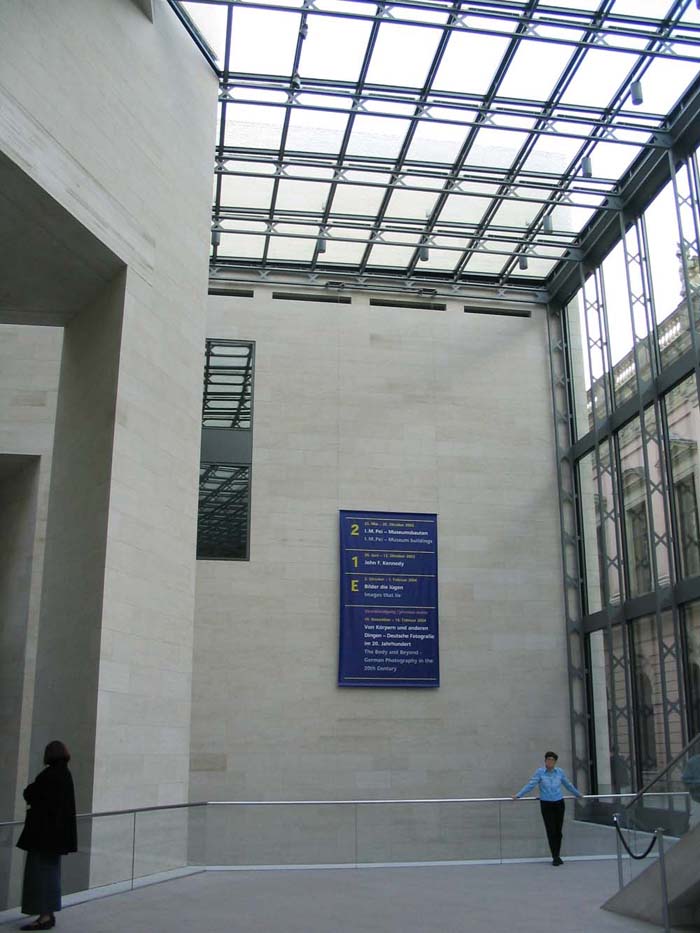 它的周圍有19世紀(jì)新古典主義派的代表人物,德國畫家及建筑師卡爾·弗里德利希·辛克(Karl Friedrich Schinkel, 1781-1841)著名的老博物館建筑和新瓦赫(Neue Wache, 1816-1818年建造的古典主義風(fēng)格建筑,60年代起被用作納粹及軍國主義統(tǒng)治下受害者的紀(jì)念堂)以及安德列阿斯·施呂特的巴洛克風(fēng)格建筑等。要建造的新館只有很少幾處能看見其立面,而且必須在設(shè)計(jì)中規(guī)劃出許多使用面積來,這些對(duì)新館的建造都是極其困難的條件。由于貝聿銘在諸多博物館建筑設(shè)計(jì)中所取得的成功,聯(lián)邦德國政府因此認(rèn)定,惟有貝聿銘才是這項(xiàng)設(shè)計(jì)唯一合適的理想人選。
