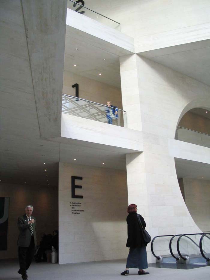 談到2003年5月底落成開放的博物館新樓的特色時(shí),貝聿銘說:“我設(shè)計(jì)的樓梯塔是有些好奇,但是它應(yīng)該是這樣的。”他接著說:“它應(yīng)該引誘人們?cè)谶@個(gè)大樓里走動(dòng),充滿好奇與享受。”事實(shí)正是如此,每走一步就展開了明亮大廳的新景色,向外看,展現(xiàn)的又是柏林市中心的建筑。樓梯塔內(nèi)的階梯平坦,完全可以安心地從地面觀賞到外面的天空,或者欣賞近在幾米之外的雄偉的巴洛克建筑“軍械庫”。這個(gè)古建筑目前正在加緊修繕,因?yàn)檫@座菩提樹下大街最古老的建筑到2004年底將和貝聿銘設(shè)計(jì)的擴(kuò)建大樓一起成為完整的德國歷史博物館。軍械庫7500平方米的展覽面積將長期展示德國兩千年的歷史;貝聿銘建筑則用于舉辦專題展覽,兩座建筑將由一個(gè)地下通道相連。