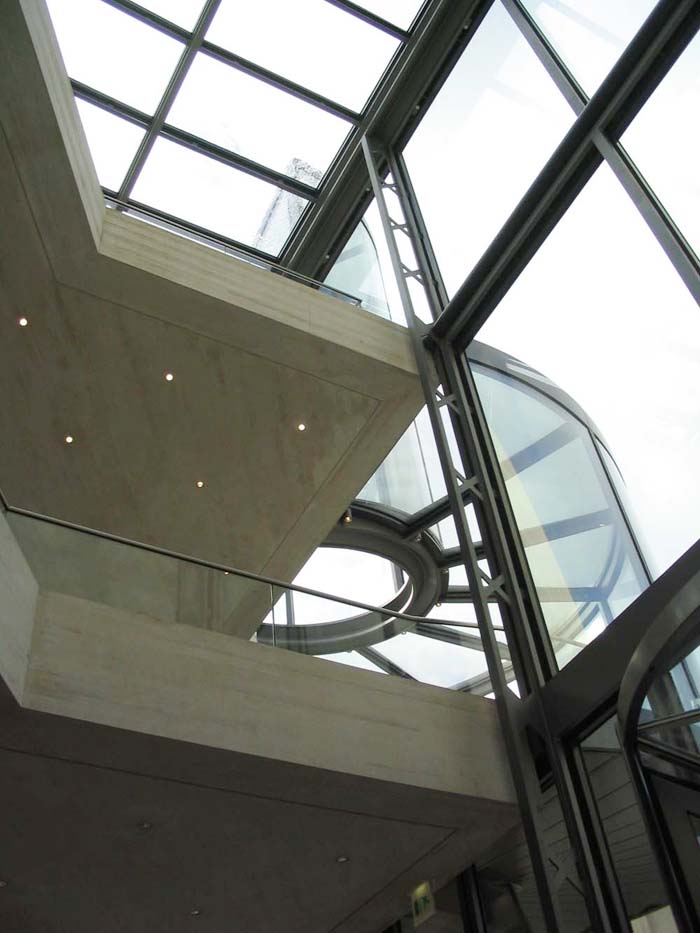 貝聿銘以一個(gè)略帶弧形,幾乎與主體建筑等高的玻璃廊廳妥善地解決了同巴洛克建筑軍械庫之間距離上的沖突。這個(gè)玻璃廊廳使人們可以仰望天空。在地下層設(shè)有連接新老博物館的通道。天橋,廊臺(tái),梁腹板,樓梯在不同的高度交叉連接,限定著廊廳的區(qū)域。在建造中廊廳采用了同巴黎盧浮宮金字塔一樣水晶般的最高品質(zhì)玻璃,從視覺上拓展了狹小場(chǎng)地的范圍。玻璃墻幕既分隔開兩幢建筑物,又使其相互關(guān)聯(lián)。博物館的參觀者在映現(xiàn)的巴洛克建筑富麗堂皇的背景下閑逛的同時(shí),古老的建筑也隨之在“運(yùn)動(dòng)”。貝聿銘還在新館的入口處很有自我意識(shí)地對(duì)著巴洛克建筑和宮殿建筑的豁口設(shè)置一個(gè)玻璃的螺旋樓梯塔。在這個(gè)沒有回旋余地處聳立這么個(gè)“捕捉眼”可以說幾乎是唯一的可能,使新館在體形上有一個(gè)吸引點(diǎn),將人們的注意力從軍械庫和新瓦赫的阻隔后面吸引過來。因?yàn)檫@樣的玻璃螺旋樓梯塔常被用在百貨商店或購物中心,所以也有批評(píng)者對(duì)此謹(jǐn)慎地提出了批評(píng)。事實(shí)上建筑美的創(chuàng)造不僅僅是建筑師突發(fā)奇想的結(jié)果,更主要的是根據(jù)其功能需要所作的安排。在剩下的建筑用地約近2000m2上貝聿銘設(shè)計(jì)了一個(gè)簡潔明了的三角形幾何體。各展覽大廳都分布在里面。三角幾何體是貝聿銘在建筑設(shè)計(jì)中經(jīng)常使用的基本形式,在他著名的建筑中都曾運(yùn)用到。華盛頓國家美術(shù)館東館是兩個(gè)相互構(gòu)成個(gè)梯形的三角形;香港的中國銀行大廈是由一組排列和旋轉(zhuǎn)了三角體構(gòu)成;巴黎盧浮宮金字塔是由四個(gè)三角形在一個(gè)正方形上筑成的空間。