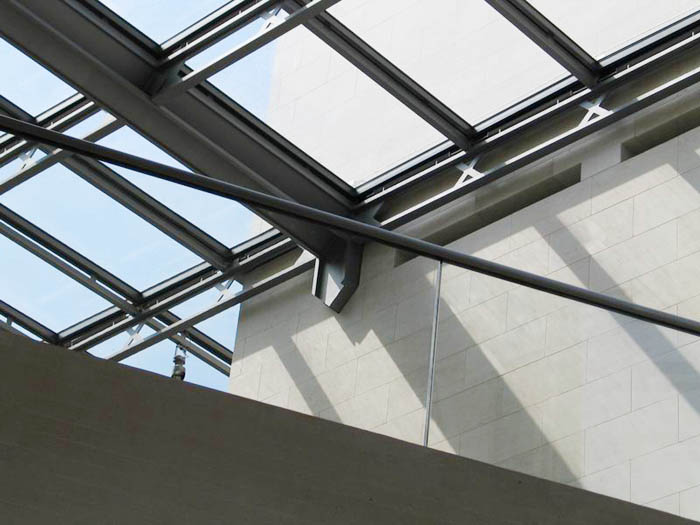 新館的墻面材料同它對(duì)面的古典建筑非常匹配,但同時(shí)又體現(xiàn)出時(shí)代的風(fēng)貌。封閉建筑體的外墻以及玻璃大廳內(nèi)的墻壁都以精致磨光的法國石灰?guī)r石作貼面。承重的樓層板都以被稱作為“建筑混凝土”,一種專門加了色的混凝土材料制成。它的紋理是采用精細(xì)的俄勒岡松木板(Oregon Pine)的紋理加工做出。大廳的地面是用北美洲帶有玫瑰色發(fā)亮晶斑的花崗石(Mason)鋪成。在展覽室區(qū)域還考慮了靈活可變的供電方式。所有通風(fēng)管道和電器設(shè)備都被置于雙層地板中間。櫟木木條拼合成的正方形地板塊可以隨時(shí)更換成帶有電源接口的板塊,以致于能在房間的任何地方提供電源。照明采用屋頂下照光源。展覽廳的突出照明可通過燈光軌道移動(dòng)。這些軌道在屋頂上按總規(guī)劃元素-三角形網(wǎng)格進(jìn)行布置。僅在三樓的屋頂,這些三角形網(wǎng)格是以錐形來構(gòu)成,目的是要通過這些附加的三維體突出強(qiáng)調(diào)最高層展廳的屋頂。另外還有些細(xì)部,如天窗,沿樓梯的嵌入式壁燈,樓梯臺(tái)階板,樓梯扶手等的形式和造型無不體現(xiàn)出貝聿銘不僅是個(gè)精細(xì)的建筑大師,而且還是個(gè)具有超高水平的藝術(shù)家。