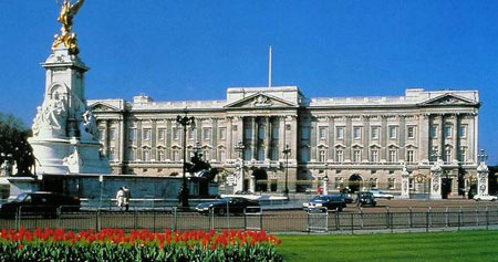 英國王宮,在英國倫敦。1703年白金漢宮爵始建,1837年維多利亞女王繼位,正式成為王宮。宮殿豪華,內有宴會廳、音樂廳等600多個廳室,正宮前廣場中心有維多利亞女王石像。宮前每日上午十一時半至十二時之間舉行皇家衛隊換崗儀式。