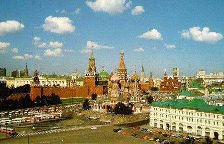 在俄羅斯莫斯科市中心,曾為莫斯科公國和十八世紀以前的沙皇皇宮,十月革命勝利后,成為黨政領導機關駐地。1156年始建,后屢經擴建,為一古老建筑群,主要有大克里姆林宮、圣母升天教堂、政府大廈、伊凡大帝鐘樓等。宮內塔樓是裝有五角紅寶石星。現亦作為俄羅斯政府的代稱。