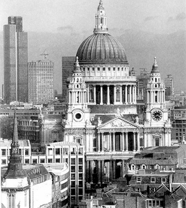 圖為圣保羅大教堂,由雷恩于1675年至1710年設計完成。其古典式的穹頂成為它外部的突出特征。雷恩,這位以前的數(shù)學家強調說:“幾何性是建筑的最基本部分。”他死后就葬在這里,墓志銘寫道:“如果你尋找紀念碑,那就看看自己的周圍。”———選自本書