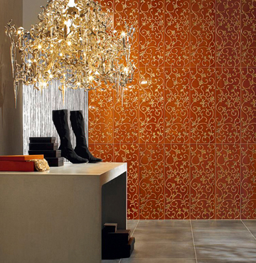 Aimée is a spatial concept in 30 x 90 cm (wall) and 45 x 45 cm (floor) formats and features a glossed surface in cream, red and black as well as decorations with exquisite artisan details. Genuine manufacturing processes and industrial production have been forged into a new type of production. This innovative manufacturing process is unrivalled, and each tile is unique. A relief with hand-laid gold or silver inlays creates the design’s plasticity. A new glazing technique has been developed which lends the precious metals an authentic mat look and, therefore, adds extra touches and value. The working of a relief in a large-format tile (30 x 90 cm) is also unique.
