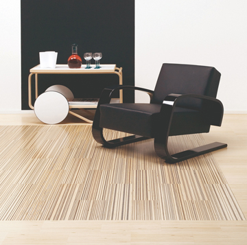 Saima is a wood flooring that reflects light in a specific way generated by the wood properties of the Finnish birch. The top layer of the precious wood does not proceed horizontally but the wood fibres are arranged vertically, thus creating the reflection effect. The most important innovation is the colouring method for the birch wood fibres, which maintain their ability of reflecting light. The colour does not only stay on the surface but penetrates all birch layers. Originally Tapio Wirkkala developed the colour in the 1980s. Now it is manufactured on an industrial scale thanks to new production methods. Pekka Toivanen designed Saima Raita as a combination of dark-coloured birch veneer layers with natural-coloured layers. The result was a special product variation. The broad range of manifold combinations, among them different options to lay the flooring, create a new sense of space.