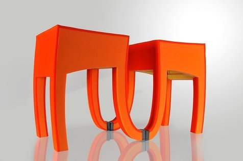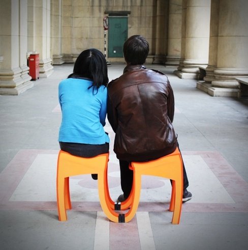 微微翹起的椅腳,像是一只延伸出去的手,邀請(qǐng)大家入座。暗藏玄機(jī)的結(jié)構(gòu)設(shè)計(jì),讓最先入座的一方感受到驚奇,進(jìn)而邀請(qǐng)另一方加入,無(wú)論肩碰肩、背靠背,在兩人間都能形成一道親密的弧線(xiàn),訴說(shuō)著一種趣味的、互動(dòng)的人際關(guān)系。椅子的斜靠設(shè)計(jì)可以讓背靠背的兩人更加貼近。
