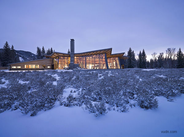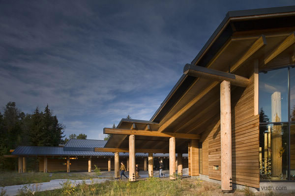 新的探險旅游中心座落在一片灌木叢草地和濱水的森林之間.穿過云杉,楊木和白楊樹林,游客被吸引到一個庭院,這里為游客提供了靜謐和私密的空間在廣闊的懷俄明州。這種的比例戶外空間為聚會和聯歡人群提供了良好的空間。屋頂傾斜向上,遠離院子,它的鋸齒形狀的邊緣似乎在向遠方的蒂頓山脈的歡呼、致敬。