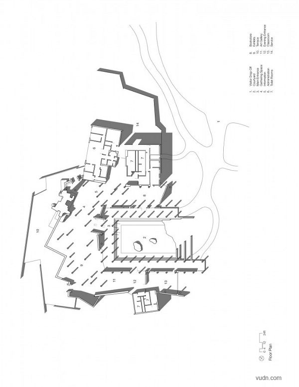 通過在院子北端前廳進入,游客被吸引到了建筑物的“心臟”---一個可以容納諸多功能、以蒂頓山脈壯麗景色為背景的型集會大廳。巨型混凝土和毛石壁爐成了房間的焦點。其他的一些輔助房間諸如書店,藝術畫廊和課堂等都毗鄰、圍繞著這個房間。