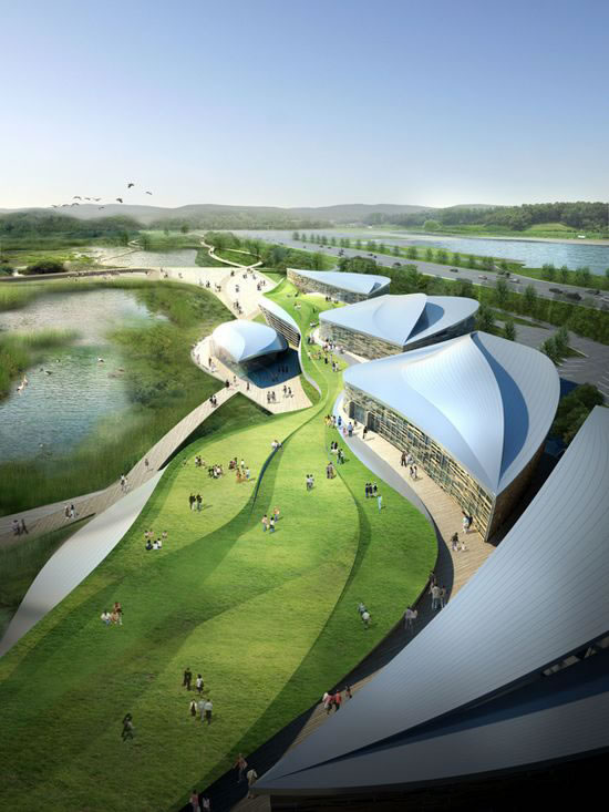 韓國的順天市是全球五大潮汐地之一,2008年這里吸引了約280萬游客前來觀賞。該設計旨在使得游客通過濕地到達順天灣,而退潮的印記就成了該項目的設計理念。游客中心位于項目的東北角,蜿蜒的道路引導著游客們感受美麗的濕地,并且可以直接到達室外展館區。