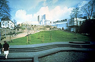 從土著部落建筑中得到的靈感成為霍萊因藝術(shù)發(fā)展道路上的轉(zhuǎn)折點,這在他后期的作品中得到了反復(fù)的體現(xiàn)。“上層”和“下層”,物質(zhì)生活空間與精神生活空間的緊密聯(lián)系使霍萊因產(chǎn)生了將建筑轉(zhuǎn)變成景觀的構(gòu)想。通過小徑、階梯和斜坡,建筑不再是孤立的,而成為城市生活中不可或缺的活躍的組成部分。