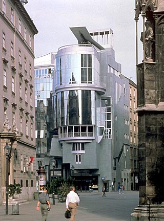 漢斯·霍萊因(Ha Hollein)知道應(yīng)該怎樣對不同的事物進行不同的處理。維也納人喜歡戲劇,因為它不同于其它的藝術(shù),戲劇處于現(xiàn)實和幻覺的交叉點上。所有的建筑,事實上包括我們的全部生活,最終證明都只是一場舞臺上的表演而已。