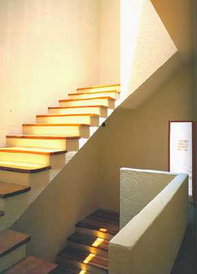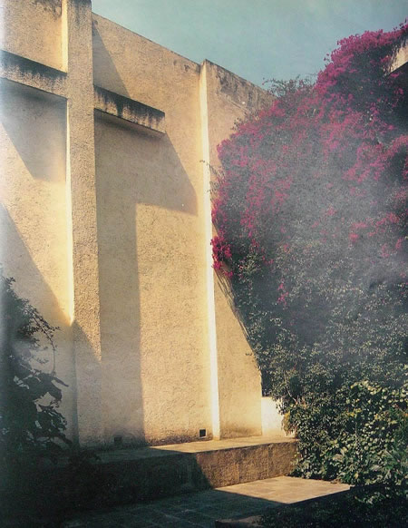 各種色彩濃烈鮮艷的墻體的運用是巴拉干設計中鮮明的個人特色,后來也成為了墨西哥建筑的重要設計元素。在巴拉干游歷歐洲的時候曾深深的被摩洛哥那種獨特的地中海式氣候下濃烈的色彩風格所打動。他發現這里的氣候與風景是那么的和諧。在回到墨西哥之后他便開始關注墨西哥民居中絢爛的色彩,并將其運用到了自己的眾多作品當中。這些色彩來自于墨西哥傳統而純凈的色彩。“這種彩色的涂料并非來自于現代的涂料,而是墨西哥市場上到處可見的自然成分染料。這種染料是用花粉和蝸牛殼粉混合以后制成的,常年不會褪色。你可以看出他常用那種粉紅色的墻,其實邊上經常有一叢繁盛的同樣顏色的花木。這是墨西哥的國花,墻的顏色就來自這些花。但是在早期,巴拉干只用紅黃藍三個原色。后來他認識了一位畫家,也許是rivera,然后他就開始自由使用色彩了?!雹?巴拉干對色彩的濃厚興趣使得他不斷在自己的設計作品中嘗試著各種色彩的組合。這也許并不是他對色彩可意的研究而是一種體驗。這種體驗使他能夠極好的駕御各種艷麗的色彩,使幾何化的簡單構筑物透出絲絲溫情,并用色彩塑造空間給空間加上魔幻詩意的效果。他的色彩實際上是在毫無羈絆的表達著作者的各種情感與精神。