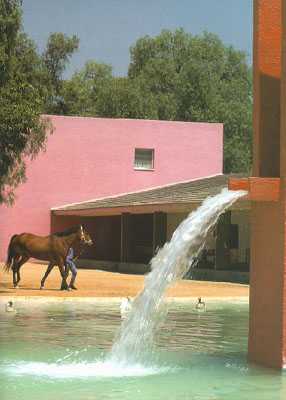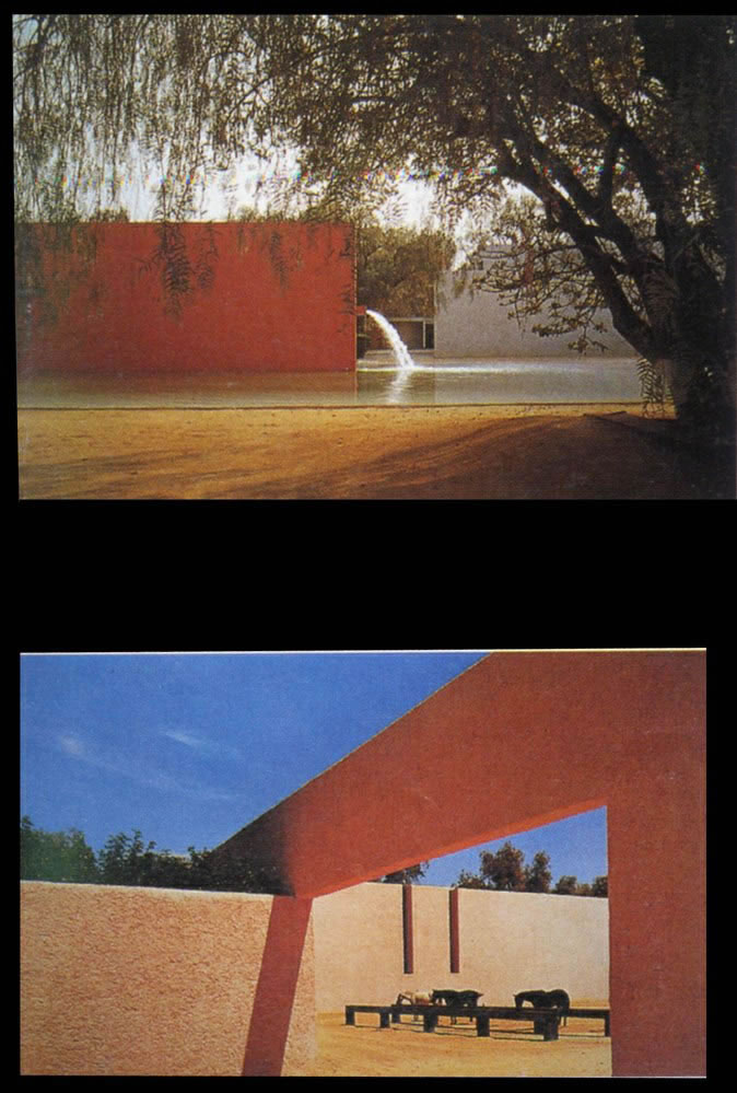 各種色彩濃烈鮮艷的墻體的運用是巴拉干設計中鮮明的個人特色,后來也成為了墨西哥建筑的重要設計元素。在巴拉干游歷歐洲的時候曾深深的被摩洛哥那種獨特的地中海式氣候下濃烈的色彩風格所打動。他發現這里的氣候與風景是那么的和諧。在回到墨西哥之后他便開始關注墨西哥民居中絢爛的色彩,并將其運用到了自己的眾多作品當中。這些色彩來自于墨西哥傳統而純凈的色彩?!斑@種彩色的涂料并非來自于現代的涂料,而是墨西哥市場上到處可見的自然成分染料。這種染料是用花粉和蝸牛殼粉混合以后制成的,常年不會褪色。你可以看出他常用那種粉紅色的墻,其實邊上經常有一叢繁盛的同樣顏色的花木。這是墨西哥的國花,墻的顏色就來自這些花。但是在早期,巴拉干只用紅黃藍三個原色。后來他認識了一位畫家,也許是rivera,然后他就開始自由使用色彩了。”巴拉干對色彩的濃厚興趣使得他不斷在自己的設計作品中嘗試著各種色彩的組合。(如圖)這也許并不是他對色彩可意的研究而是一種體驗。這種體驗使他能夠極好的駕御各種艷麗的色彩,使幾何化的簡單構筑物透出絲絲溫情,并用色彩塑造空間給空間加上魔幻詩意的效果。他的色彩實際上是在毫無羈絆的表達著作者的各種情感與精神。