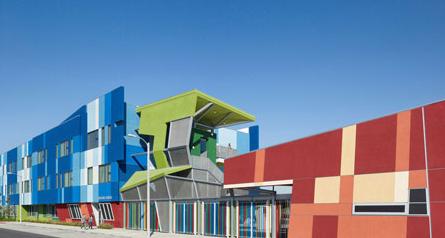 社區居民將其昵稱為"彩虹學校",大膽的色彩運用給學生們的學習提供了有趣的環境。立面采用了創新性的節能設計方案,在有限的預算下實現了較好的效果。