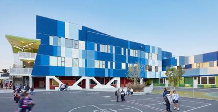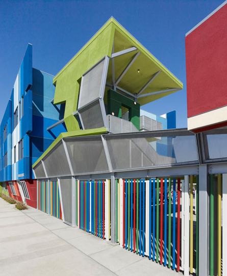 這座學校提供了功能性很高的富有活力的環境,滿足了周圍社區的需求,也啟發了學生的創造性。設計組與"洛杉磯統一校區"合作,設計了一個可滿足21世紀需求的學習環境。設計者召集了社區成員和利益相關者進行討論,確定了新學校的設計方向。它既滿足了社區對于多樣性的需求,又以藍色、紅色、綠色和橘色來反映出社區的多文化現狀。
