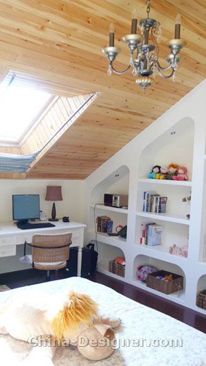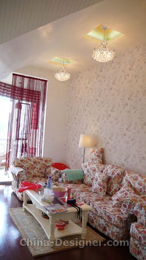 陳鑫杰:澳景花庭的一個頂層戶型的設(shè)計,坡屋頂,開如比較頭痛,后來設(shè)計完后效果不錯,現(xiàn)代田園手法處理,春意盎然。