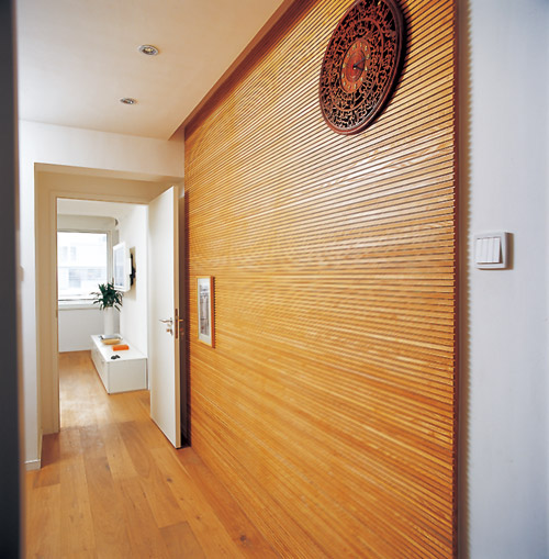 “我不喜歡沒有用的裝飾。”找遍王泉的家,看不到任何炫耀性符號,一切樸素而低調,幾何美感與純粹美學支配著這個家的視覺呈現。直線條體現在裝飾面板的豎線和百葉窗的橫線中,間有立燈的弧線調劑。色調以白色為主,兼有冷色調的青色與溫暖的原木色。建筑師將許多建筑材料運用于室內。王泉說他不喜歡室內室外兩重天,也不喜歡特別室內的材料。因此,石材、陽光板、水泥、紙與木大量運用在設計中,“我喜歡它們真實的質感。”王泉說。