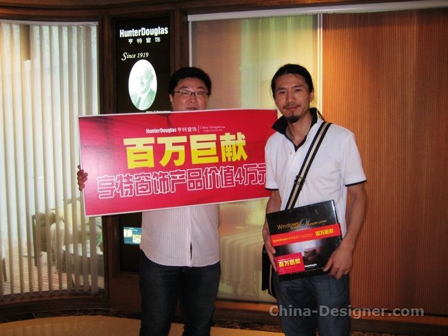 從2011年5月至8月,指定20個城市的設計師都可以通過簡單的網絡報名方式參與抽獎,每位獲獎設計師均可免費獲得荷蘭亨特道格拉斯集團送出價值高達4萬元的全球窗飾產品和服務(全國共25份,總值達到百萬),并自動成為亨特窗飾的“光影大使”,可以自主決定將產品運用到自己的家居裝飾或工裝項目上,且該設計作品還有機會入選《亨特奢華窗飾作品集》。