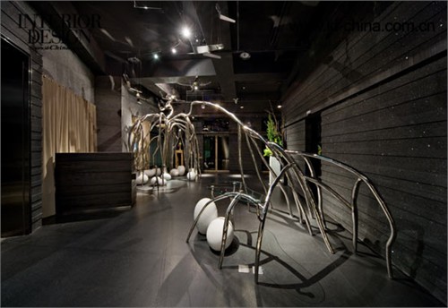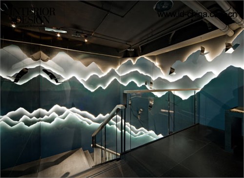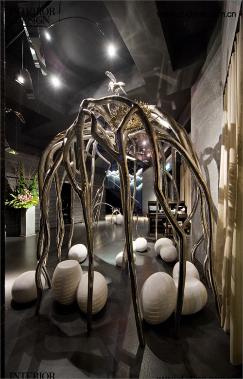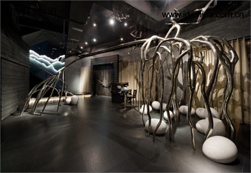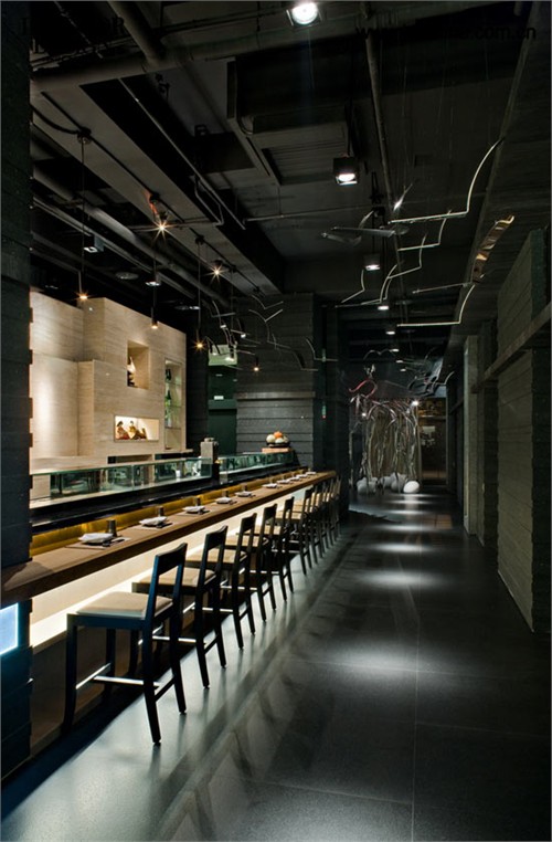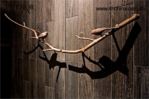空間故事的起點(diǎn),長(zhǎng)出一株由大樹(shù)演化、蔓延盤生出似鳥(niǎo)籠的窩,大樹(shù)鳥(niǎo)籠盤護(hù)著鳥(niǎo)蛋、呵護(hù)著鳥(niǎo)群、溫暖著暫歇的旅人。在闡釋設(shè)計(jì)理念的過(guò)程中,設(shè)計(jì)師覺(jué)得樹(shù)形的鳥(niǎo)籠孕育著空間的精神,提供養(yǎng)分予眾生,空間與心靈共生共息。隨之而來(lái)的是場(chǎng)域天際間,盤旋飛舞著鳥(niǎo)群(似覓食的旅人),穿串著整場(chǎng)一、二樓空間;鳥(niǎo)-遇山(一樓端點(diǎn):意象山形的光墻;樓梯銜接:層迭似云似山的光帶),鳥(niǎo)-遇水(一樓壽司吧:漫流的吧臺(tái)瀑布),鳥(niǎo)-遇花朵(空間點(diǎn)綴的裝飾),完整表現(xiàn)出空間與藝術(shù)品的相互輝映與對(duì)話層次。