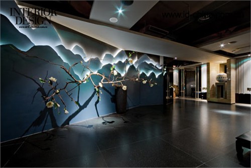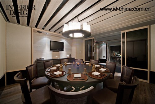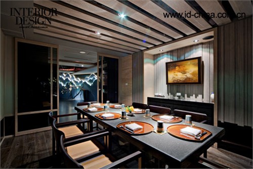 一樓主入口進(jìn)門的右側(cè)為連接至2F用餐區(qū)的行進(jìn)動(dòng)線,整組樓梯墻面妝點(diǎn)著以鐵板層迭層次錯(cuò)落呈現(xiàn)之藝術(shù)創(chuàng)作,設(shè)計(jì)上取材發(fā)想自我個(gè)人收藏的席德進(jìn)畫作<石門水庫(kù)>而來(lái),是一幅意象上渲染飄邈山形且色系空靈的大作。設(shè)計(jì)創(chuàng)作表現(xiàn)上,在鐵板層次間安裝LED燈帶點(diǎn)出線條的輪廓表現(xiàn),在行進(jìn)走動(dòng)間感受其空間氣勢(shì)。2F用餐區(qū)部分均為包廂區(qū)的用餐環(huán)境。設(shè)計(jì)上以溫暖木質(zhì)色系的調(diào)性,呈現(xiàn)與1F空間的區(qū)別。2F前區(qū)空間作為進(jìn)入包廂前的轉(zhuǎn)折區(qū),也可利用做不干擾用餐進(jìn)行的談話空間。2F包廂廊道以細(xì)長(zhǎng)條型分割風(fēng)化木作表現(xiàn)處理,期許以細(xì)膩的設(shè)計(jì)手法,營(yíng)造空間的靜膩與長(zhǎng)條廊道連續(xù)性的層次感。2F包廂共有7組獨(dú)立包廂間可使用,其中有4組包廂運(yùn)用活動(dòng)隔屏,彈性調(diào)整包廂空間尺度。連續(xù)包廂間外區(qū)為原有空間的陽(yáng)臺(tái)區(qū),設(shè)計(jì)上運(yùn)用裝飾藝術(shù)手法妝點(diǎn)打造成用餐后花園的感覺(jué)。