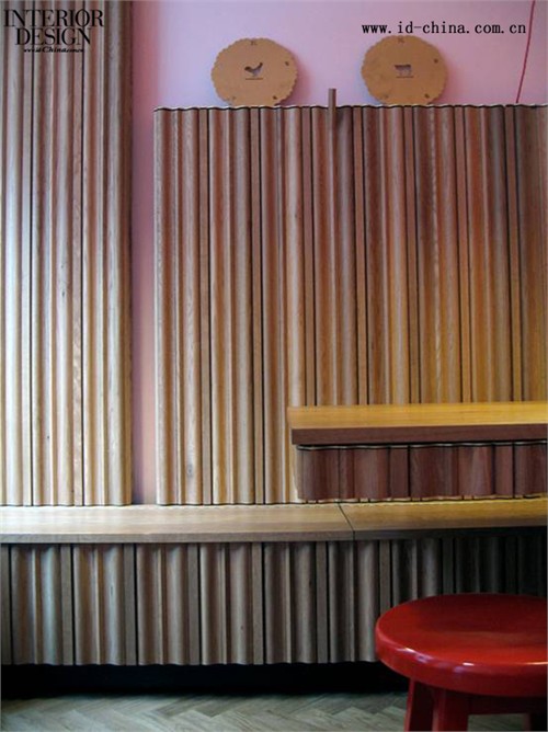 “大自然有自由自在的天然感覺,我想把那種感覺升華,做得更舒服”。這間餐館的設計材料為橡木鑲板,設計師用橡木面板制成了靠背、墻體隔板、攤位,邊緣由模壓板與黃銅板材連接。別致有趣的高靠背落護板豎立在地面上,形成一個個桌位與反弧復合改良型橡木分區。而橡木則根據模具的不同被切割成衣帽鉤、燈、形成“pie crust”與桌子,甚至這里擺放的鐘也是由橡木制成的。他認為這樣的設計既能表現菜肴原汁原味的特色,同時也能利用生態材料柔化濃重的幾何線條,令人放松身心,舒適的就餐。從窗外看,空間內起起伏伏的木色自然延展開,即便身處鋼筋水泥環繞的倫敦都市,也能享受片刻的叢林自然之感。 如果想用中國的古話來形容Rosa's給人的感覺,可能“長短相形,高下相傾”是比較貼切的了。這里除了有天然的建材,明確的線條也是特色之一。在這個講究造型藝術的時代,直線是可以通過其背景的明度或色彩有別最容易叫人識別的了。Rosa's里充斥著各種直線,為的就是給每位來此的顧客留下深刻的印象。“我們的眼睛是生來就是觀看光線下的各種形式的。基本的形式是美的形式,因為它們可以被辨認得一清二楚。”現代主義大師柯布西耶在《走向新建筑》一書中寫道。在Gundry & Ducker的這個設計,從空中的天花,再到平面的家具布局,在三維與二維空間里利用最簡單的直線,表達著最具張力、最具審美價值的藝術形式。這種穩定、理性,而且富有秩序性的幾何線條,以其自身所具有的規則感與秩序感,更為簡潔利落地分割空間,形成塊面一體的整體效果,便于餐館的管理。同時,單純的直線能夠滿足來此就餐的人追求單純、簡單、放松的心理,滿足了就餐環境的本質需求。