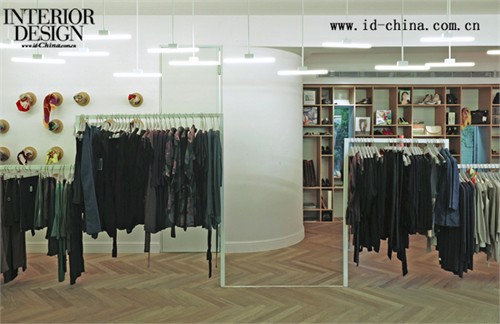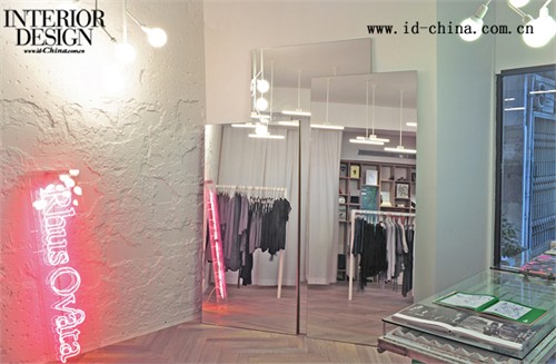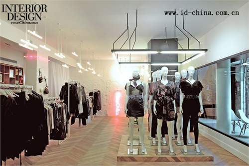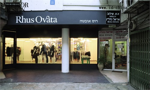 Rhus Ovata是以時尚前衛為特色的時尚品牌,標新立異的設計詮釋了它對時尚的敏銳觸覺和影響力。Rhus Ovata在Tel Aviv的店面位于一條繁忙的時尚購物街邊。為了配合Rhus Ovata極具顛覆性的時尚風格,K1p3 Architects的設計師們沒有將店面的入口面向人流熙熙攘攘的主要街道,而是背向人行道設置。店面面向人行道的一面設計了指引標志,告訴顧客Rhus Ovata店面入口所在。繞過這座極不起眼的房子,便是Rhus Ovata店面的入口。K1p3 Architects試圖在店面的空間中由外向內營造出延展的水平空間深度,因此,在面向街面的入口處,櫥窗被設計成黑色邊框的鏡框式,凸顯了內部的深度,并將室內景象帶給街道上的人們。 由同樣設計為鏡框式的門進入Rhus Ovata,新復古主義是主要的服飾風格。K1p3 Architects在室內設計了一個起伏的線性裝置,使得顧客在這里被分為三條線路,線性裝置同時作為衣架,容納了大部分展示的服飾。重點展示的服飾被設置在中央凸起的平臺上,并由天花板上吊起的線框裝置加起強調。這兩部分線性裝置構成了主要的室內空間分隔。燈光的設計與之相配合,分為水平性燈光與點狀燈光,前者用于整體照明,在天花板上形成均勻的漫射光線;后者用于重點照明,另外設置的霓虹燈則用于配飾部分的強調。