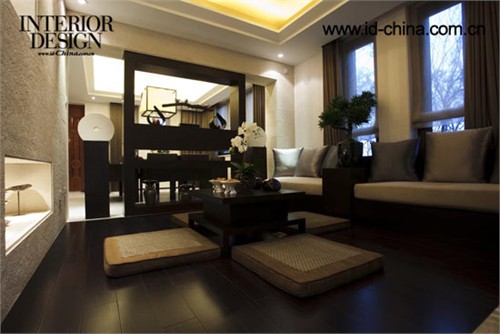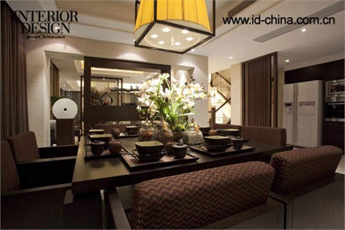 依次往里,分別是餐廳、禪室、客廳。此案例中,設(shè)計(jì)師幾乎在每個(gè)房間都運(yùn)用到圓形燈飾。中國(guó)傳統(tǒng)建筑,講究天圓地方,這里象征天地人屋和諧統(tǒng)一,提升整個(gè)居室文化韻味。當(dāng)然客廳也無(wú)一例外的運(yùn)用別致的球形燈飾,正方體的木框,整個(gè)罩住燈體,代表著傳統(tǒng)的東方文化“無(wú)規(guī)矩則不成方圓”,素色絲質(zhì)亮面沙發(fā),不銹鋼單椅以及坐墩包圍著棱角分明的方形木色茶幾,柔和了茶幾硬朗的線條,充分展示著東方人的嚴(yán)謹(jǐn)與含蓄。墻面上充滿(mǎn)東南亞風(fēng)味的掛飾以及茶幾上的椰子飾品,將新東方混搭做到極致。