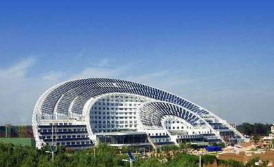 它號稱世界上最大的太陽能建筑,日月壇微排大廈總建筑面積達到7.5萬平方米,在全球首創實現了太陽能熱水供應、采暖、制冷、光伏并網發電等技術與建筑的完美結合,建筑整體節能效率達88%,每年可節約標準煤2640噸、節電660萬度,減少污染物排放8672.4噸,是全球首創性地實現了太陽能熱水供應、采暖、制冷、光伏并網發電等技術與建筑的完美結合。 4.電谷錦江酒店