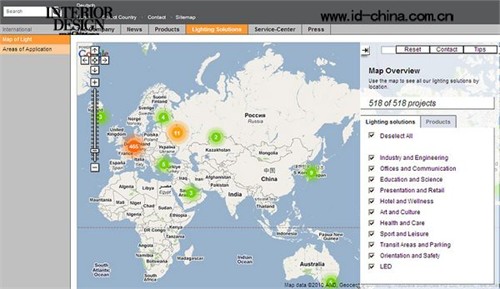 通過(guò)選擇菜單,您可以根據(jù)照明應(yīng)用領(lǐng)域來(lái)挑選查看具體項(xiàng)目或者搜索運(yùn)用于某個(gè)項(xiàng)目的特定產(chǎn)品。您感興趣的項(xiàng)目會(huì)隨著世界地圖的放大而顯示的更清楚。點(diǎn)擊&ldquoIrdquo;可以獲得項(xiàng)目關(guān)鍵信息一覽。同時(shí)提供一個(gè)專門的鏈接讓您進(jìn)入更豐富的圖片庫(kù)。