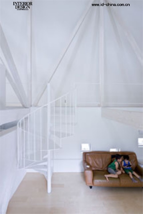 湘南住宅(Shounan House)的主立面是一個可以從街道上一眼看到的大大的斜面,建筑的特征也正在于這個夸張的屋頂形式。在建筑主入口處,斜面被切開一條長方形的口子,這里正好滿足業者三個停車位的需要,同時使入口空間有了一個雨棚。通過交叉支柱的結構方式支撐了整個住宅,在靠近地面的地方系統的安置了些小方窗,這樣有更利于室內的空氣循環。