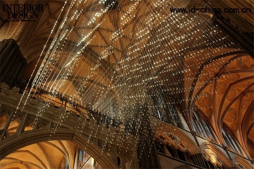 ldquo;光之浴”是英國藝術家Bruce Munro最新的建筑雕塑作品,這件作品曾在索爾茲伯里主教堂的最高點展出。這件雕塑作品由2000個閃閃發光的光點/淚珠狀擴散體組成,每一個光點都被安裝在光纖鏡片的末端,一起從總教堂的塔尖頂傾瀉而下。雕塑整體體量為10m x 10m x 7m,它所覆蓋的區域與一個普通住宅別墅的面積相近。索爾茲伯里主教堂的歷史可追溯到1258年,教堂長134.7m ,塔尖最高點距地面123m,“光之浴”盤旋在教堂上空,猶如一團發光的云朵。