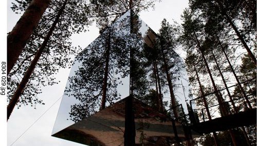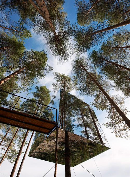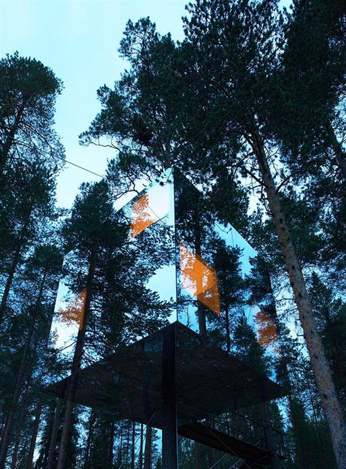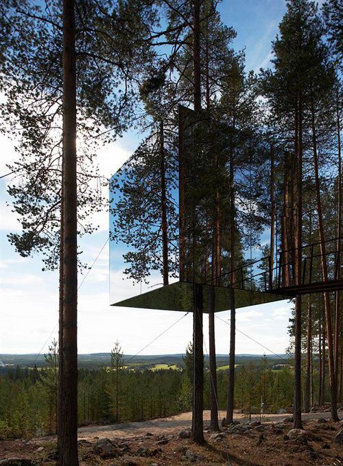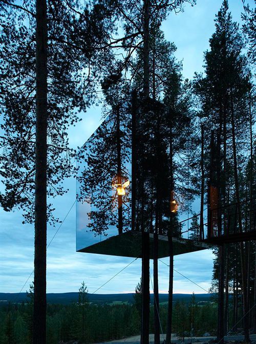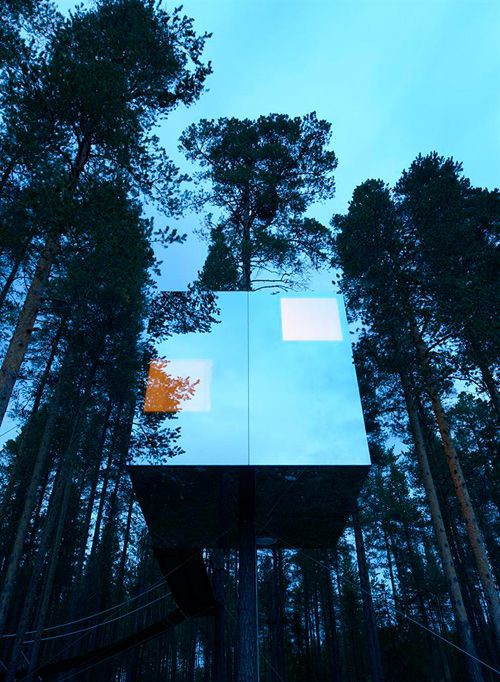 樹屋賓館位于瑞士北部小村莊Harads的附近,接近北極圈。這是一個(gè)樹上的避難所,懸掛在樹干上的輕質(zhì)鋁結(jié)構(gòu),亦是覆蓋鏡面玻璃的4m&time4m&time4m的盒子。盒子外表面反射著周圍的美景和湛藍(lán)的天空,給人們創(chuàng)造了一個(gè)極具偽裝效果的居所。室內(nèi)全部由膠合板制成,通過(guò)窗戶可以360°地觀賞四周的景色。