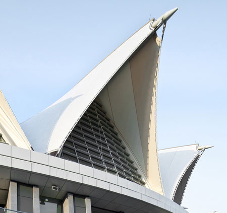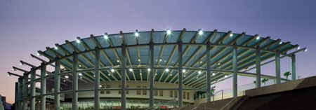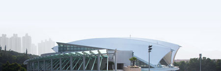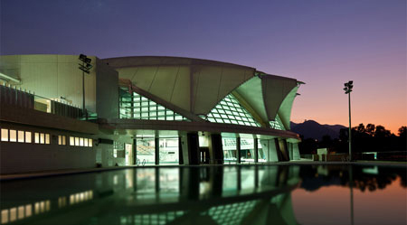 為了反映出所在海岸的地理位置以及作為水上運動館的特點,游泳館看上去像是一片拍在海灘上的貝殼,利用雙層PTFE薄膜和輕質長跨度的鋼構系統形成有機和符合空氣動力學的外觀。利用薄膜,游泳館內部終年都可以沐浴在陽光中,又避免了室外光線的刺眼。同時,雙層薄膜之間的空氣起到了冷卻作用,保持室內溫度的舒適,也阻隔了噪聲。
