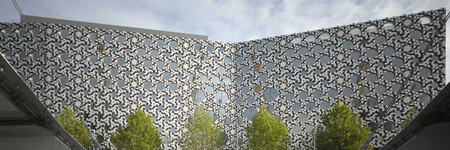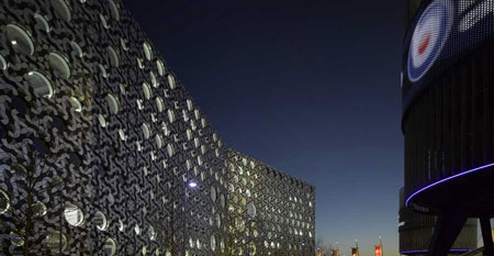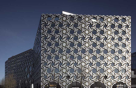 FOA事務所(Foreign Office Architects)設計的倫敦Raveourne學院,非常靠近北格林威治體育場(穹頂),為此在尺度和幾何外觀上不可避免會產生沖突。FOA在設計時時刻注意不讓新建筑與其“鄰居”抗爭,以同質化的立面來模糊與周邊的界線,但同時又顯得獨特而現代。白色纖維與棋盤格狀的板材并列,不是實心的,也沒有大塊的孔洞和尺度感,與傳統的概念大相徑庭。