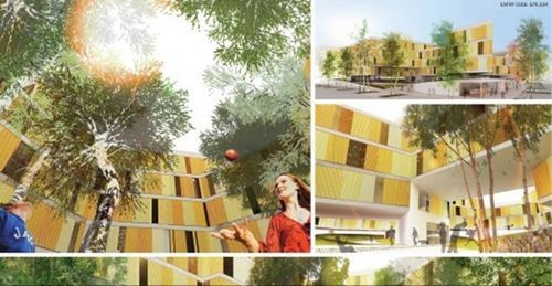 它應該是這樣一種尺度:當孩子們在庭院中玩耍時,房屋中的父母能聽見孩子們的笑聲;當孩子們抬頭仰望時,他們能看清窗口中父母的臉孔。因此設計師認為建筑的層數以兩至三層為宜,最多不超過四層。這樣的建筑高度將允許樹冠從屋頂伸展開去,吸引鳥兒盤旋歌唱,居民也能更接近自然。
