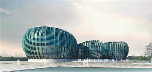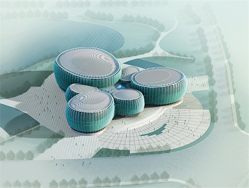 方案采用多院線聚合的平面與空間構思及珠圓玉潤的建筑形式。將一個大劇院及五個影院分置于建筑平面的三個獨立演播廳內。大小不一的建筑空間有如綠色的珍珠由天而降,落在中心公園這張巨大的玉盤之上發出悅耳的天籟之音。六顆珍珠緊密地圍繞中心大廳,烘托著劇院特有的主旋律,又恰似一朵藝術奇葩開放在城市之濱。巨大的百葉將陽光充分調節,避免了直射光引起的能源消耗,同時又將自然風引入室內大小不同的共享空間,體現了低碳建筑的設計理念。