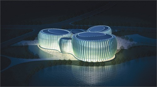 本方案由天津大學建筑設計規劃研究總院推薦,以“聚落式”為設計構思。總建筑面積達30860平方米,其中地上部分16916平方米,地下部分13944平方米,總投資3.5億元,劇院規模1200座,影院5廳(658座)。