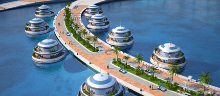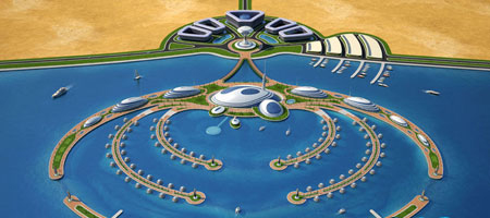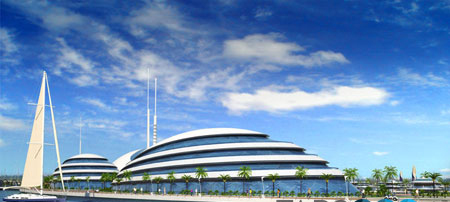 這個創新性的飯店度假村計劃是由意大利的Giancarlo Zema設計集團完成的,是半沉入海中的一個工程,從陸地延伸到海洋中,因此被叫做"兩棲1000"(Amphibious 1000)。與陸地平行一公里的是兩只"胳膊"。陸地上的工程是幾座住宅樓、辦公樓和一座海港。所有的建筑以半圓的形制圍繞著一座中心大廈建造,大廈頂端有一座可觀看全景的餐廳。