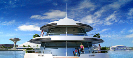 錨定80套漂浮套房的平臺被稱作"水母",可通過人造暗礁觀賞到水下景觀。每一座平臺的末端都設有燈塔。安裝了電動設備后,這些平臺能夠按照生態環境的狀況進行移動。水上的交通以20米的鋁制快艇來實現,這些快艇裝備了氫動力引擎。連接陸地和海洋部分的橋梁種植了花草,主建筑用鋼材建造,地板全部是柚木。內部空間配備了必要的照明系統。