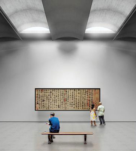 這座1.1萬(wàn)平方米的博物館讓人回想起古代中國(guó)文人的花園,周?chē)球暄训男胶腿煌瑢痈叩耐ピ骸]^低的庭院有入口通道和商店,中層的庭院是教育中心和公共空間,高層的庭院里則有展出的各幅書(shū)法作品。在直角相交的亭閣之間還有小花園等。